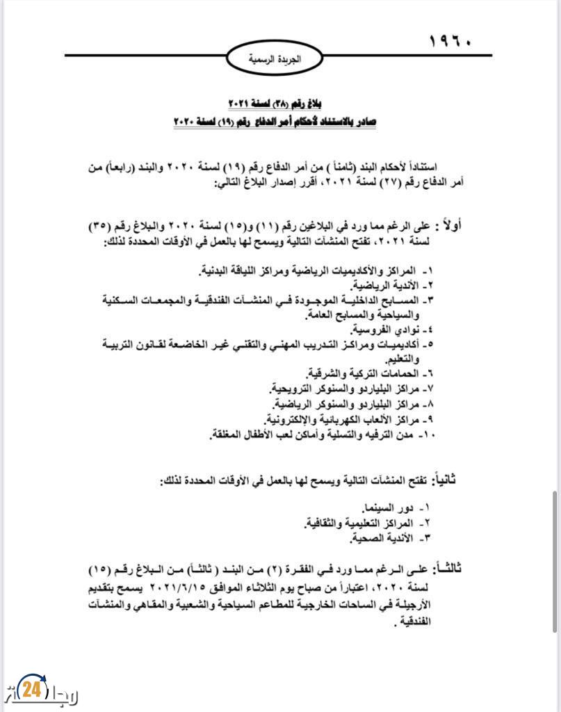 وبموجب أمر الدفاع رقم 38، سيتم أيضا السماح لبعض القطاعات المغلقة والأنشطة بالعمل، شريطة التزامها بالتدابير الوقائية.