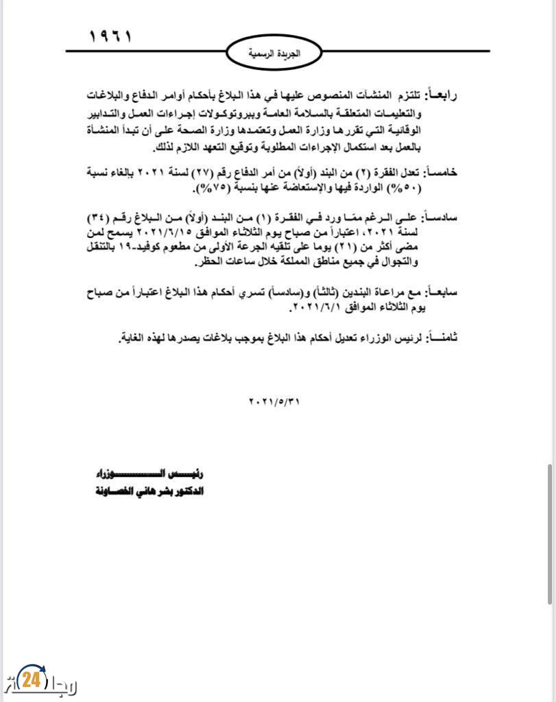 سمح رئيس الوزراء الأردني بشر الخصاونة لمن مضى أكثر من 21 يوما على تلقيهم الجرعة الأولى من اللقاح المضاد لكورونا التجوال خلال ساعات الحظر بدءا من منتصف يونيو الحالي.