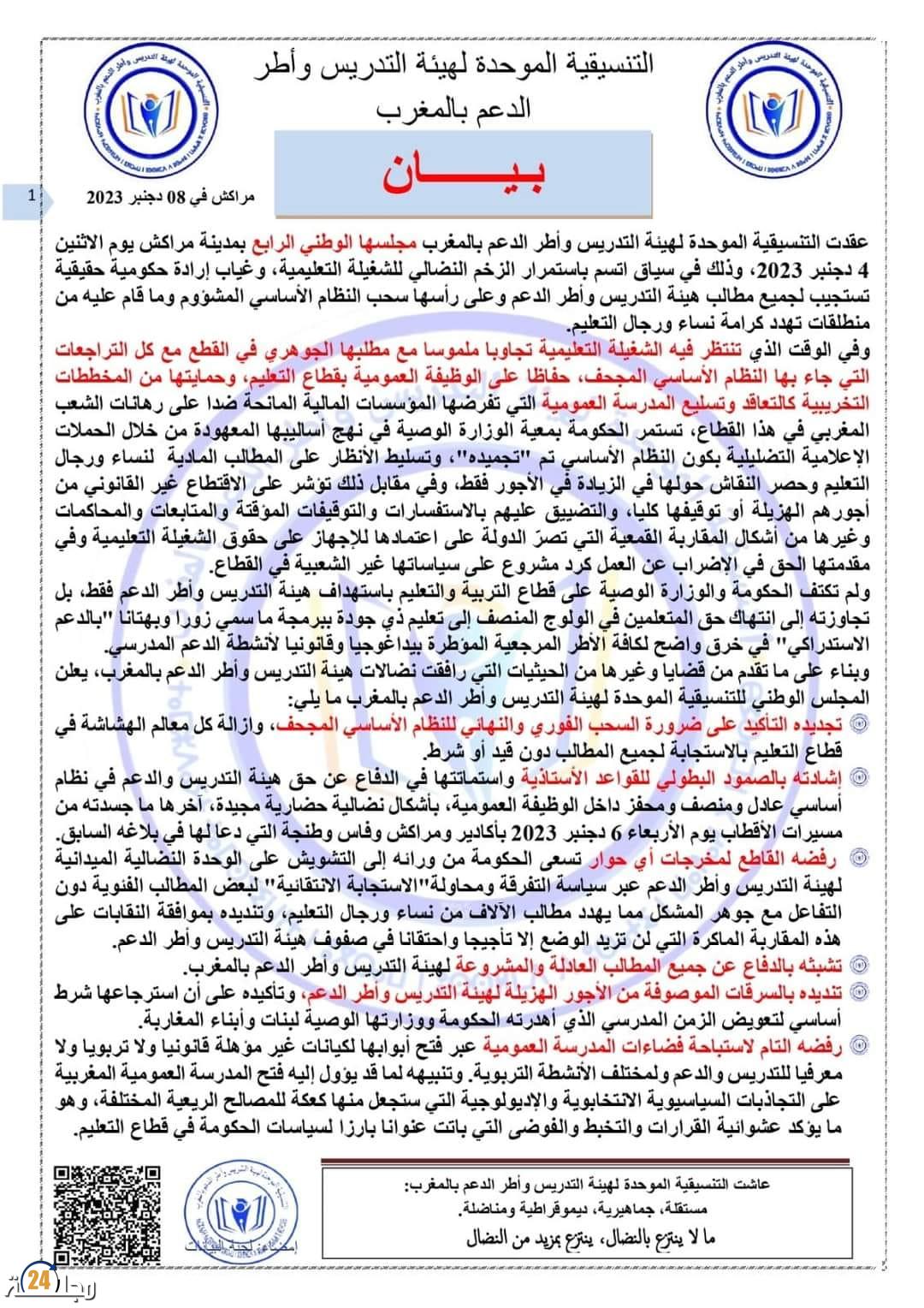 وأكد الأستاذ طلوع أن التنسيقية الموحدة لهيئة التدريس وأطر الدعم ترفض مخرجات الحوار بين الحكومة والنقابات، معتبرا أن الأساتذة والتلاميذ والمدرسة يحتاجون اليوم إلى قرارات مستعجلة من أجل استكمال الموسم خاصة أن بلادنا اليوم تعرف أطول هدر زمني مدرسي. كما أن السرعة في المصادقة على قانون المالية 2024 يؤكد سوء نية الحكومة في الاستجابة لمطلب الزيادة في الأجور.