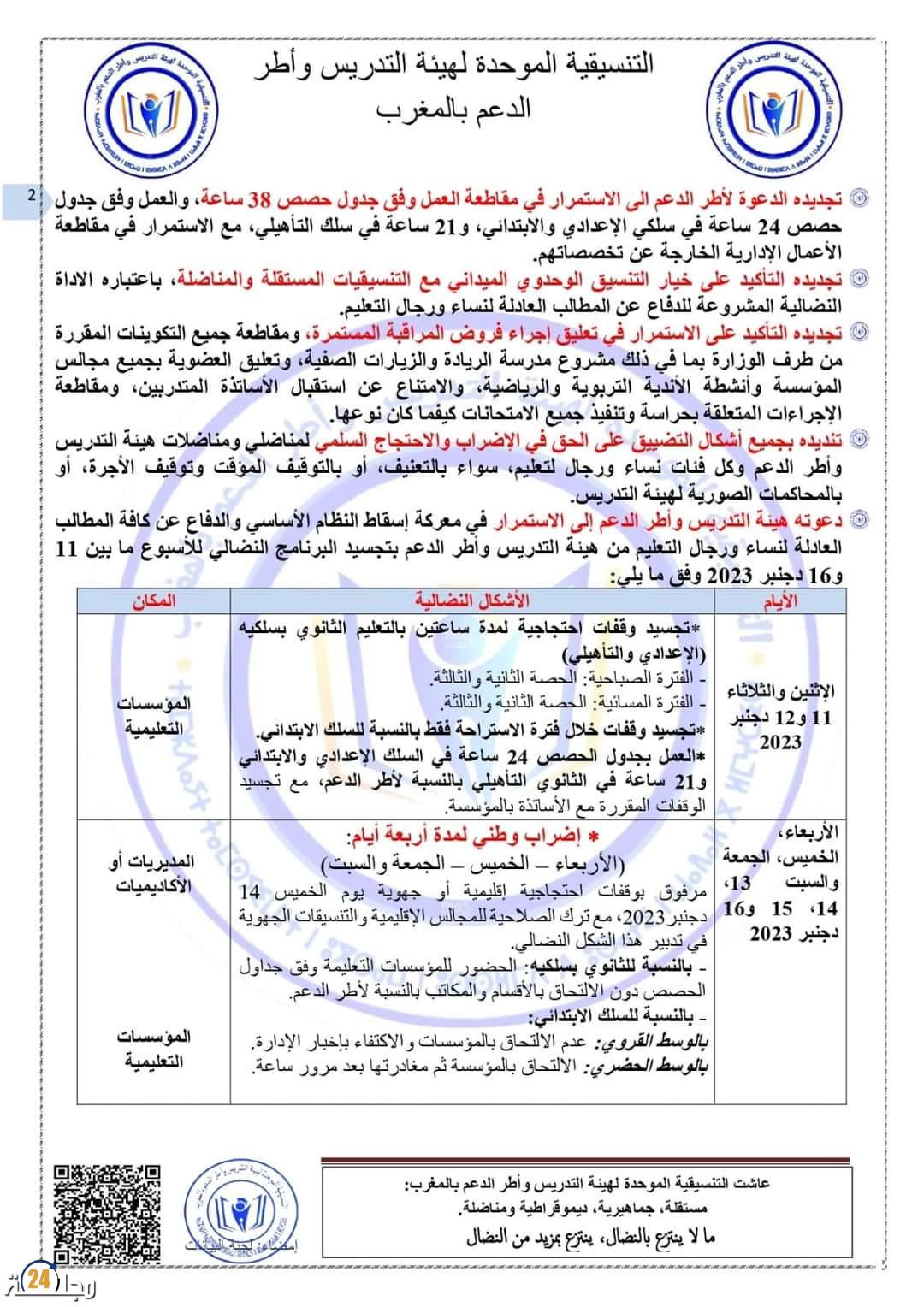 تخوض التنسيقية الموحدة لهيئة التدريس وأطر الدعم بالمغرب إضرابا وطنيا أيام الأربعاء والخميس والجمعة والسبت (13/14/15/16) دجنبر 2023 مع تجسيد وقفات أمام المديريات والاكاديميات.