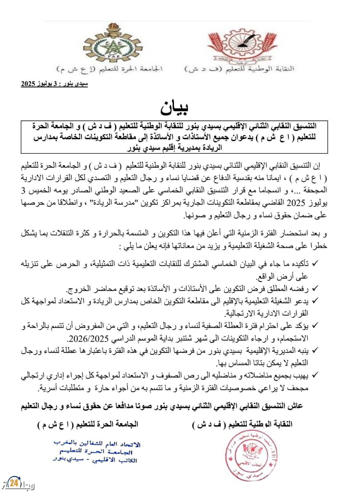 وطالب التنسيق النقابي بتجميد كافة أشكال التكوين في العطلة الصيفية، وتأجيلها إلى بداية الموسم الدراسي 2025-2026، داعياً الوزارة إلى انتهاج مقاربة تشاركية حقيقية تستحضر الخصوصيات الزمنية والمهنية للعاملين بالقطاع.