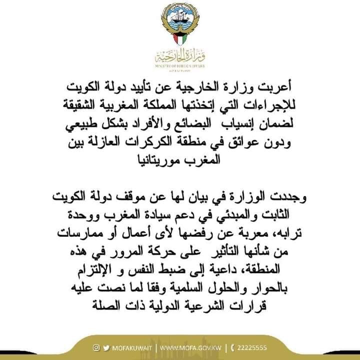 أعلنت و زارة الخارجية الكويتية ، صباح اليوم السبت 14 نونبر 2020 ، عن تأييد دولة الكويت للإجراءات التي إتخدتها المملكة المغربية لضمان إنسياب البضائع و الأفراد بشكل طبيعي و دون عوائق في منطقة الكركرات العازلة بين المغرب و موريتانيا .