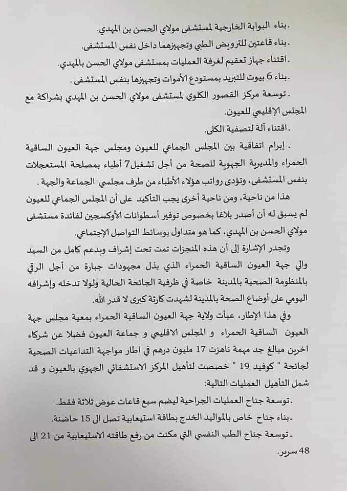 تجدر الإشارة أن جهة العيون الساقية الحمراء عرفت خلال الاسابيع الماضية إرتفاع في معدل الاصابة و الوفيات أثر بشكل واضح و ملموس على الخدمات الصحية و استهلاك مرتفع لمادة الأكسجين .