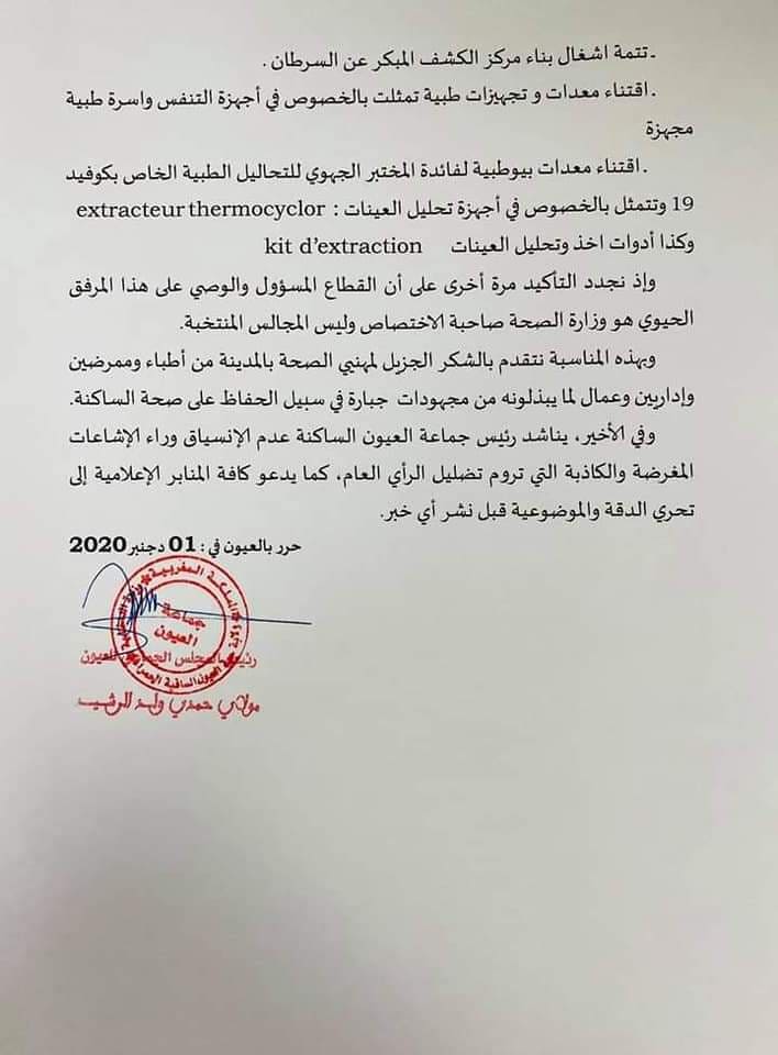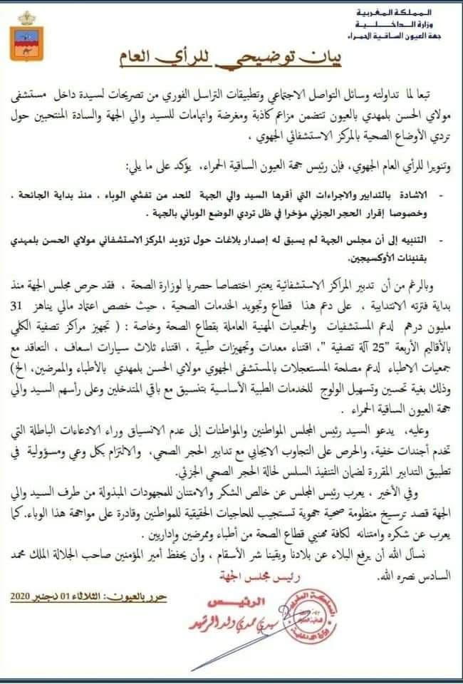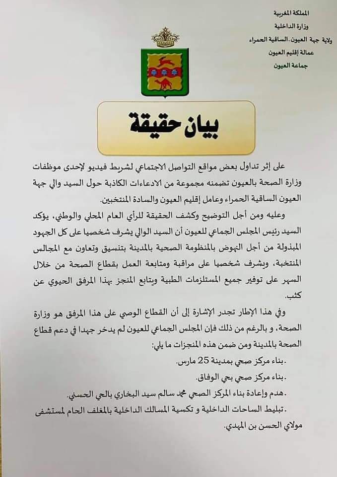 سرعان ما كان الجواب من خلال بياني مجلس جهة العيون الساقية الحمراء و مجلس جماعة العيون الذي اشاد بالدور الفعال للسيد والي الجهة خلال فترات جائحة كورونا ، كما تطرق لكل المساهمات المقدمة لقطاع الصحة بالجهة و التي استهدفت مراكز صحية و كذا المستشفيات من خلال توفير موارد بشرية و أدوية و معدات طبية ، كل ذالك بتنسيق و دعم مباشر من السيد والي جهة العيون الساقية الحمراء حسب البيان .
