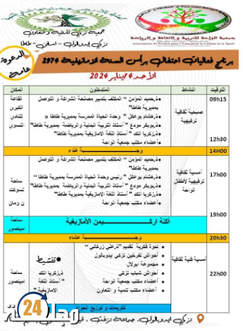 تنظم جمعية الواحة للتربية و الثقافة و الرياضة بشراكة مع جمعية تزكي للتنمية و التعاون،فعاليات تخليد رأس السنة الامازيغية 2974 ، وستقام فعاليات هذا اللقاء بدوار تزكي ادوبالول جماعة تزغت قيادة، اسافن، عمالة طاطا.