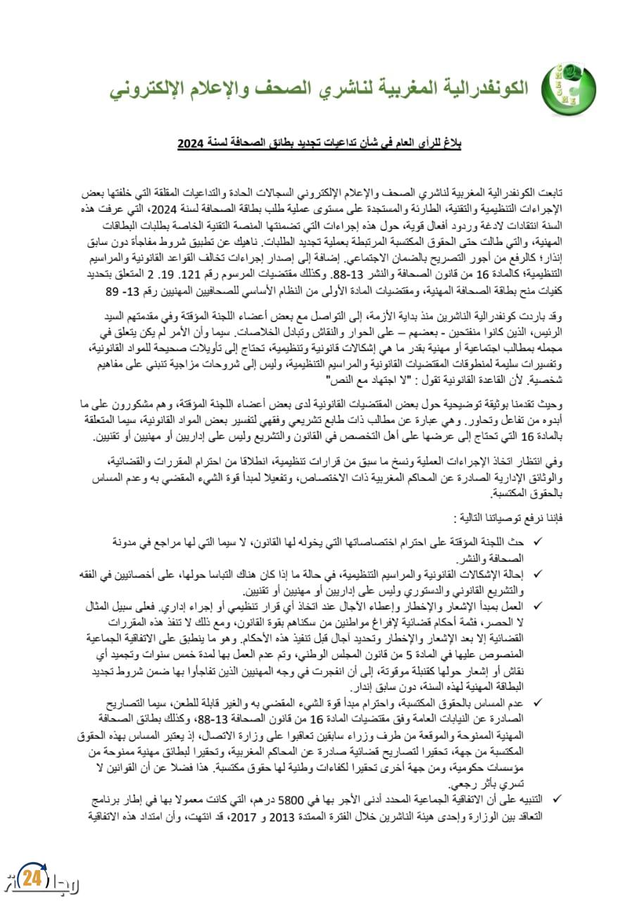 بلاغ للرأي العام في شأن تداعيات تجديد بطائق الصحافة لسنة 2024