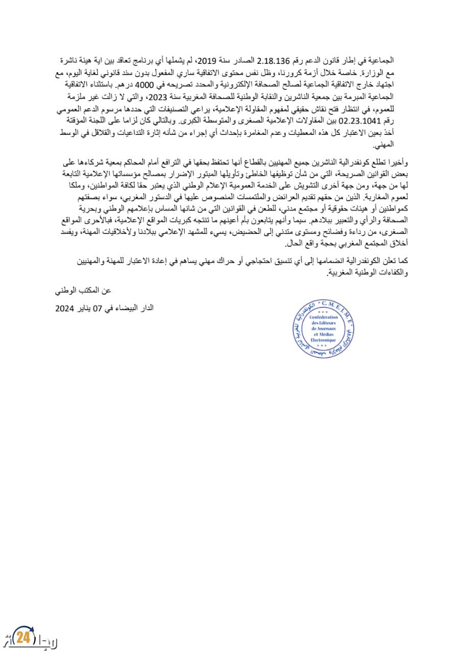 كما تعلن الكونفدرالية انضمامها إلى أي تنسيق احتجاجي أو حراك مهني يساهم في إعادة الاعتبار للمهنة والمهنيين والكفاءات المغربية وللصحافة الوطنية