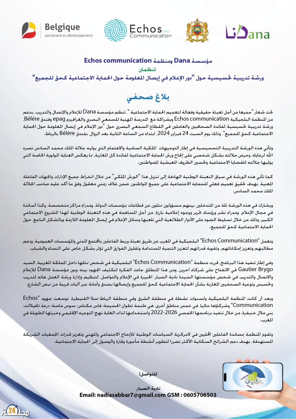 تحت شعار “جميعا من أجل تعبئة حقيقية وفعالة لتعميم الحماية الاجتماعية “، تنظم مؤسسة Dana للإعلام والإتصال والتدريب، بدعم من المنظمة البلجيكية Echos communication وبشراكة مع المدرسة المهنية للسمعي البصري والغرافيزم epag وفندق Bélére، ورشة تدريبية تحسيسية لفائدة الصحافيين والعاملين في القطاع السمعي البصري حول “دور الإعلام في إيصال المعلومة حول الحماية الاجتماعية كحق للجميع”، وذلك يوم السبت 24 فبراير 2024، ابتداء من الساعة الثانية بعد الزوال، بفندق Bélère بالرباط.