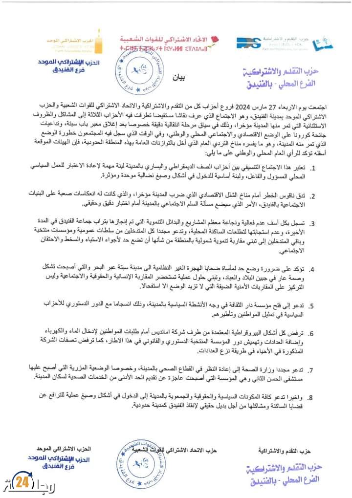 في إطار الأوضاع الاقتصادية والاجتماعية الصعبة التي تمر منها مدينة الفنيدق مؤخرا ، أصدرت فروع ثلاث أحزاب سياسية بالمدينة ( التقدم والاشتراكية ، الاتحاد الاشتراكي ، الاشتراكي الموحد) بيانا تدق فيه ناقوس الخطر حول الأوضاع العامة في المدينة ، وتنبه فيه المسؤولين إلى خطورة الوضعية الاجتماعية التي تعرفها هذه المدينة الحدودية في المدة الأخيرة ، كما أكد هذا البيان على ضرورة تبني مقاربة شمولية وتنموية في التعامل مع مأساة الهجرة الغير النظامية لشباب المدينة عبر البحر والضحايا التي خلفتها عوض الاقتصار على المقاربة الأمنية التي تبقى خيارا غير فعال في التصدي لهذه الظاهرة ومكافحة آثارها السلبية ، ورغم أن الأحزاب المذكورة تتحمل مسؤولية تدبير الشأن المحلي على الفريق المسير لجماعة الفنيدق ، فإن هذا البيان يمكن اعتباره بمثابة صرخة سياسية مدوية امام الصمت والركود الذي تشهده المدينة منذ سنوات في مختلف المستويات والأبعاد.