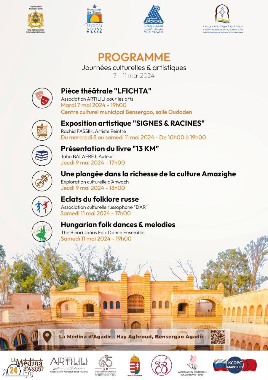 يحتضن المركب السياحي والثقافي لميدينا داكادير أيام ثقافية وفنية. وذلك في الفترة الممتدة ما بين 8 و11 ماي القادم وذلك لتنشيط الحركة السياحية و الثقافية والفنية وإبراز مكانة هذا الصرح الهندسي الكبير بالمدينة، وذلك لتنشيط الحركة الثقافية والفنية والانفتاح على ثقافات العالم، ورد الاعتبار لمركب لمدينا داكاير للقيام بأدواره الريادية الثقافية والفنية في تنشيط الحركة السياحية بمدينة الإنبعاث. ويتضمن البرنامج الثقافي والفني: عرض مسرحي بمركب اودادن بحي بنسركاو تحت عنوان (الفيشطة) لجمعية ارتليلي ، ومعرض فني تحت عنوان رموز وجذور للفنان التشكيلي المغربي : رشيد فاسح.