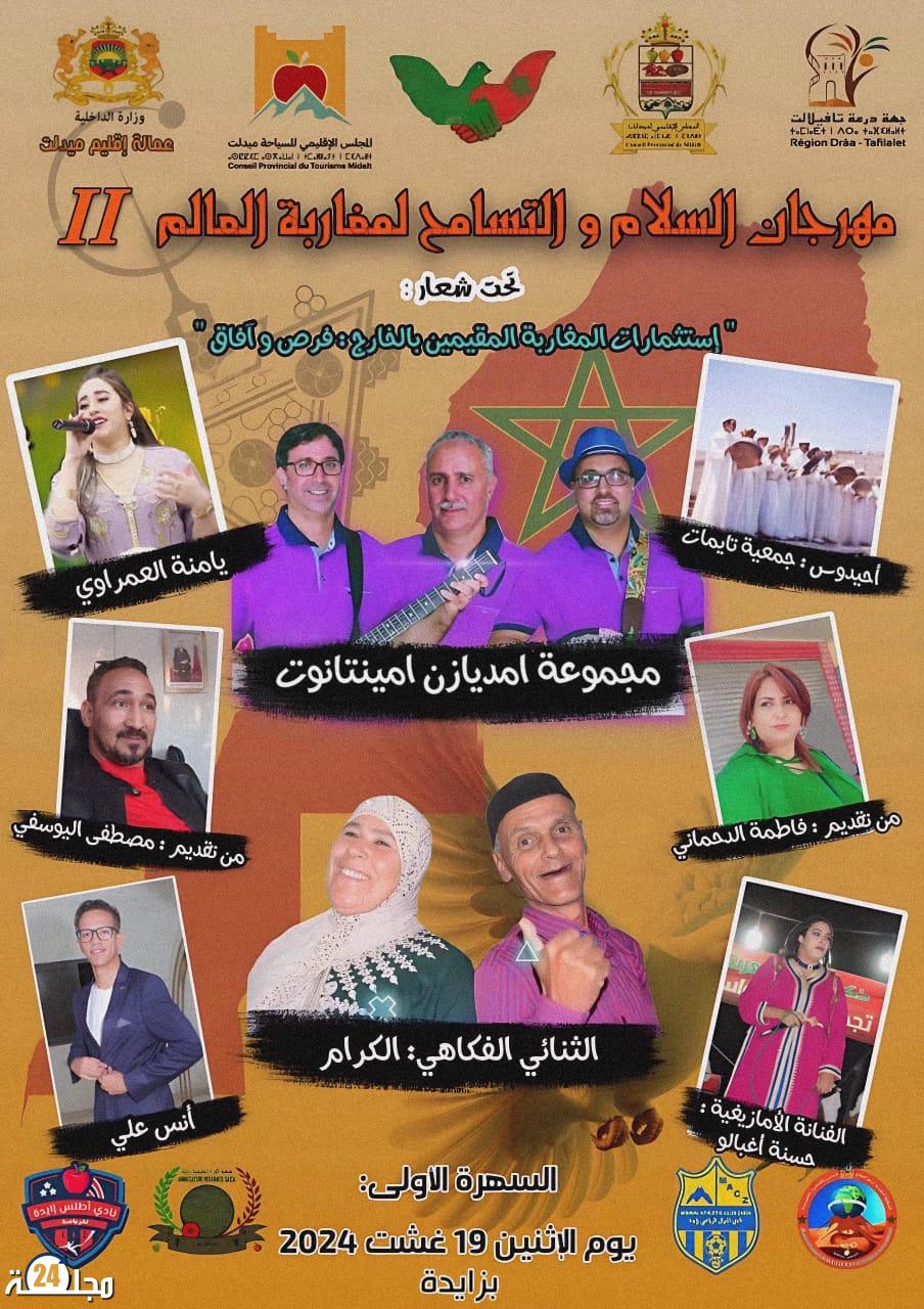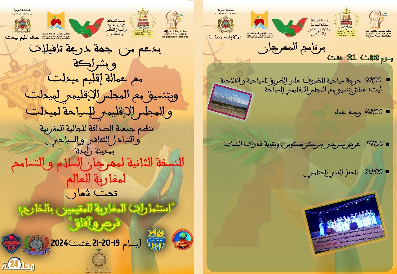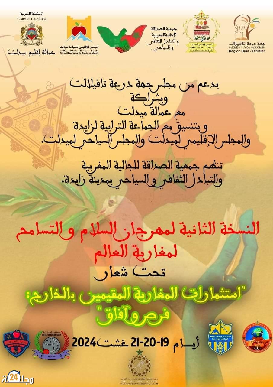 تحت اشراف عمالة اقليم ميدلت و بدعم من مجلس جهة درعة تافيلالت و بتنسيق مع المجلس الإقليمي لميدلت و المجلس الإقليمي للسياحة بميدلت و المجلس الجماعي لزايدة والسلطات المحلية بزايدة ستنظم جمعية الصداقة للجالية المغربية و التبادل الثقافي و السياحي مهرجان السلام و التسامح في نسخته الثانية تحت شعار ” استثمارات المغاربة المقيمين بالخارج فرص و أفاق ” أيام 19-20-21-2024 و ستعرف هذه الدورة تنظيم مجموعة من الأنشطة الموازية و منها معرض الصناعة التقليدية و مجموعة من الندوات و المحاضرات و عروض مسرحية و أمسية شعرية و خرجات استكشافية للمنطقة و أنشطة رياضية و مجموعة من السهرات الفنية و التي سيحييها ألمع النجوم الفنية كما سيتم تنظيم مجموعة من الأنشطة الفنية بمشاركة مجموعة من الأسماء الفنية الوطنية و الجهوية و الإقليمية و المحلية كما سيعرف المهرجان تغطية اعلامية وطنية و جهوية و إقليمية و محلية