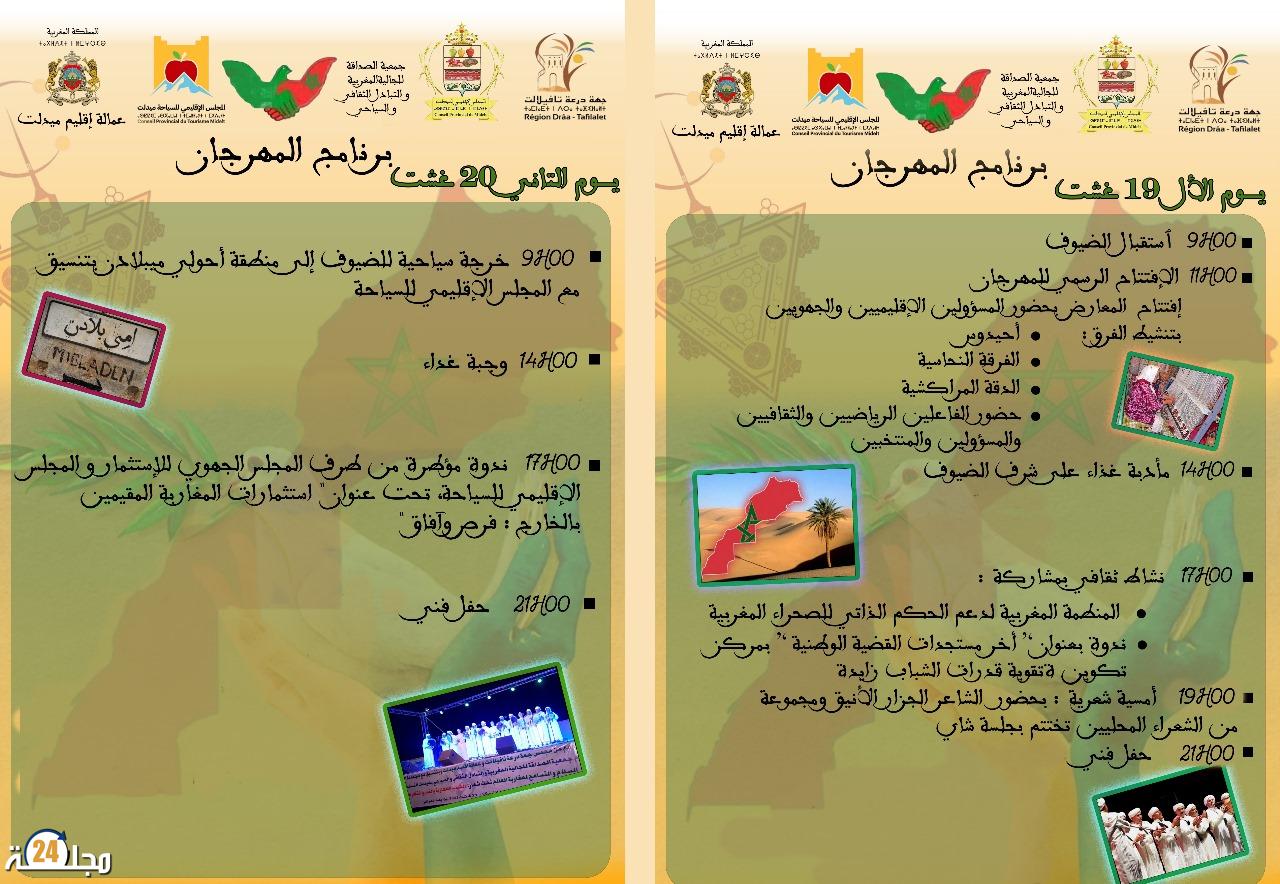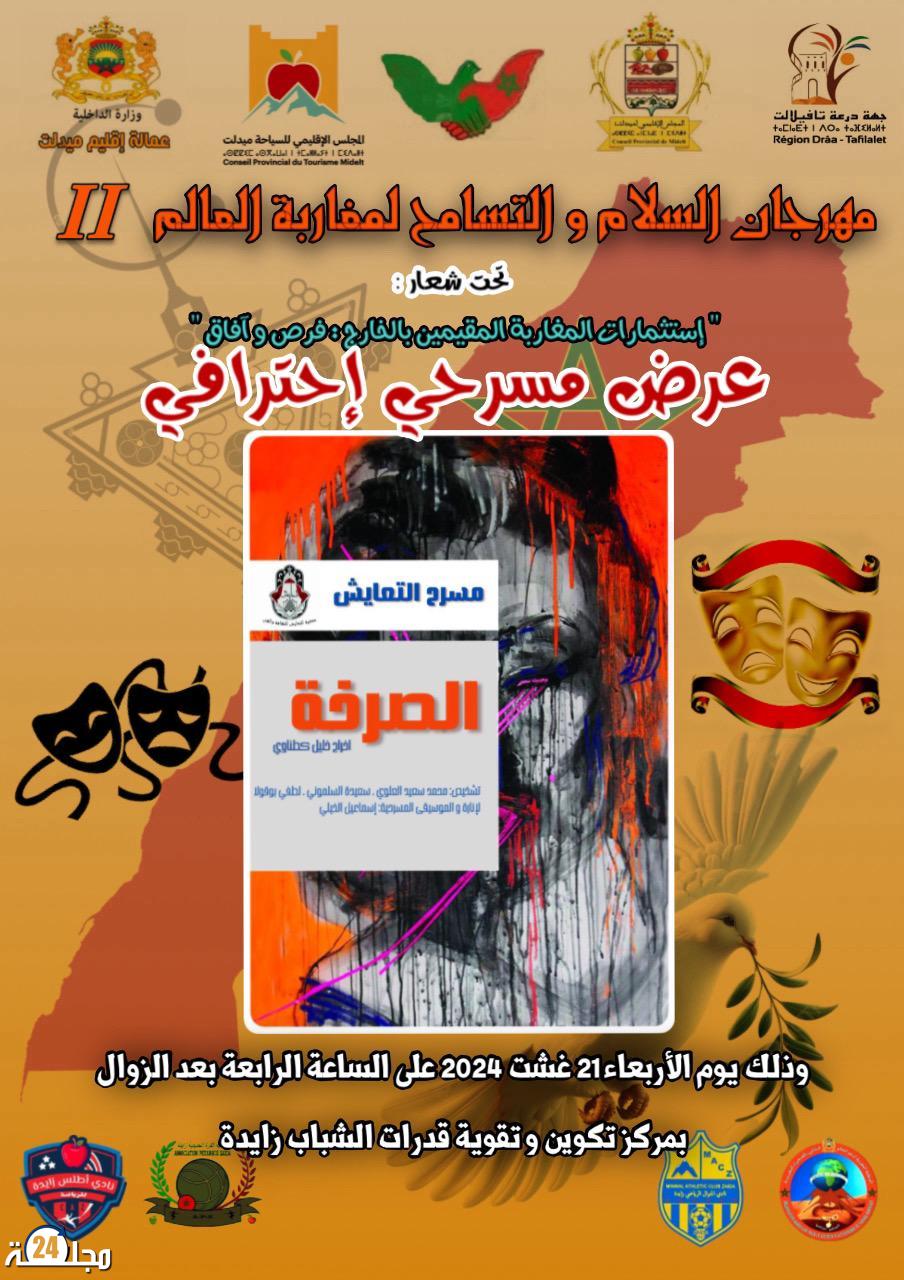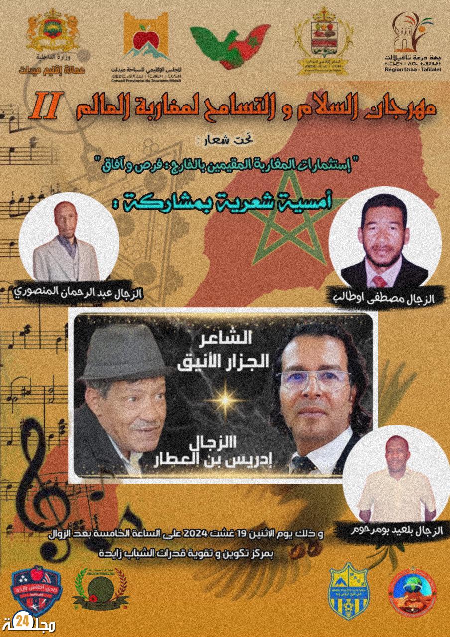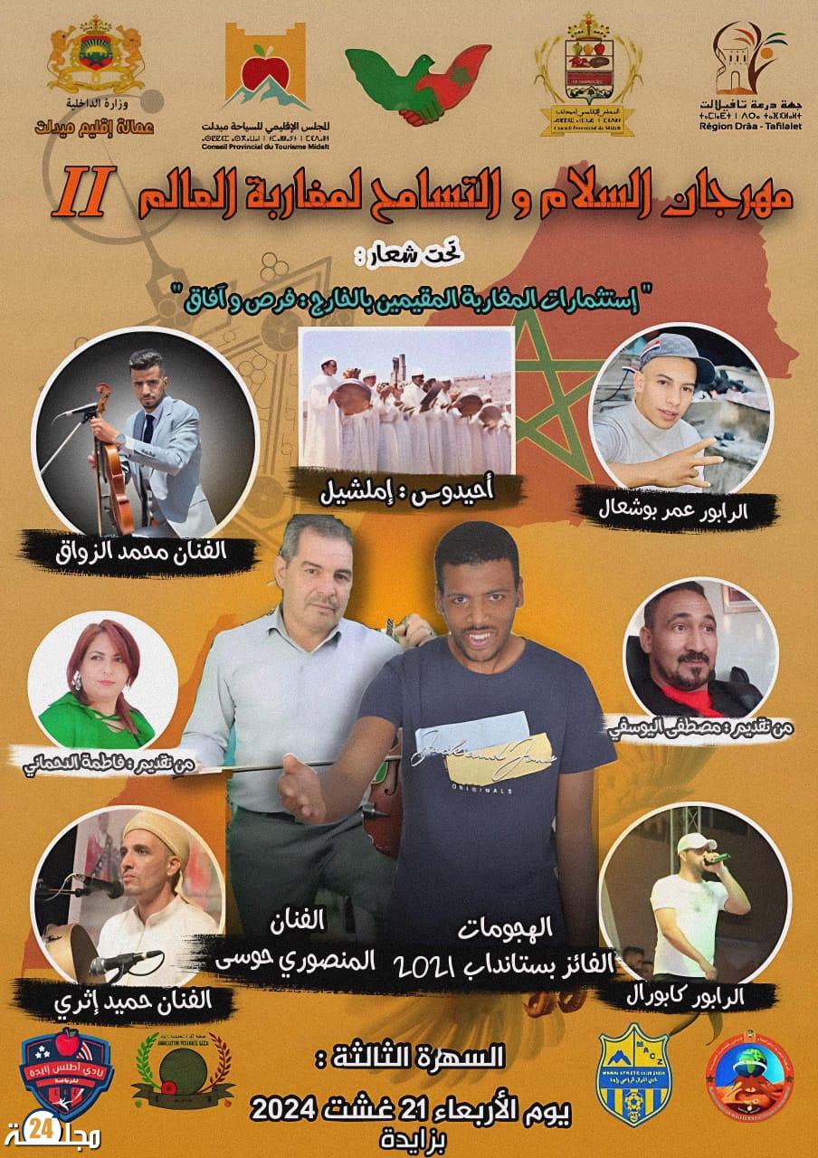 تحت اشراف عمالة اقليم ميدلت و بدعم من مجلس جهة درعة تافيلالت و بتنسيق مع المجلس الإقليمي لميدلت و المجلس الإقليمي للسياحة بميدلت و المجلس الجماعي لزايدة والسلطات المحلية بزايدة ستنظم جمعية الصداقة للجالية المغربية و التبادل الثقافي و السياحي مهرجان السلام و التسامح في نسخته الثانية تحت شعار ” استثمارات المغاربة المقيمين بالخارج فرص و أفاق ” أيام 19-20-21-2024 و ستعرف هذه الدورة تنظيم مجموعة من الأنشطة الموازية و منها معرض الصناعة التقليدية و مجموعة من الندوات و المحاضرات و عروض مسرحية و أمسية شعرية و خرجات استكشافية للمنطقة و أنشطة رياضية و مجموعة من السهرات الفنية و التي سيحييها ألمع النجوم الفنية كما سيتم تنظيم مجموعة من الأنشطة الفنية بمشاركة مجموعة من الأسماء الفنية الوطنية و الجهوية و الإقليمية و المحلية كما سيعرف المهرجان تغطية اعلامية وطنية و جهوية و إقليمية و محلية