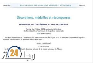 صدر بالجريدة الرسمية الفرنسية الخاصة بالأوسمة والميداليات والمكافآت، يوم 5 غشت 2024، قرار وزير الداخلية وشؤون ما وراء البحار الفرنسي، الصادر يوم 20 يونيو 2024 بشأن منح وسام الشرف من الدرجة الذهبية بصفة استثنائية للسيد عبد اللطيف حمّوشي، المدير العام للأمن الوطني والمديرية العامة لمراقبة التراب الوطني .