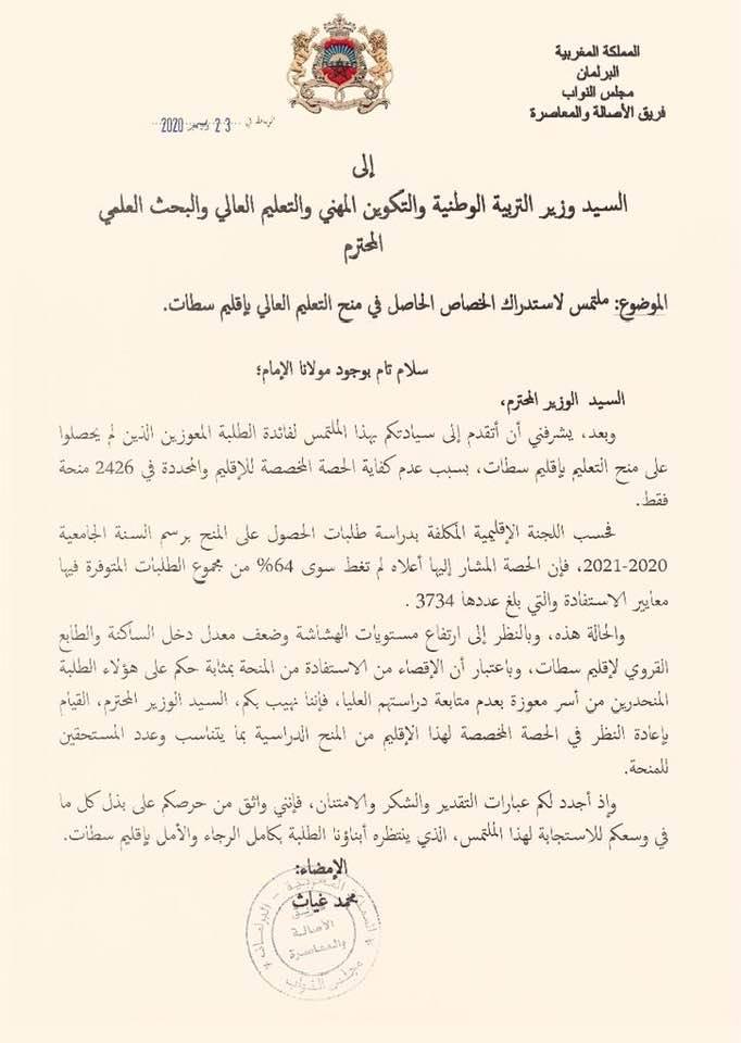 تجاوبا مع هموم الطلبة المعوزين بإقليم سطات الذين لم يحصلوا على منح التعليم بالاقليم، بسبب كفاية الحصة المخصصة للإقليم والمحددة في 2426 منحة فقط ، ومساهمة منه في إيصال صوتهم وهمومهم وانشغالاتهم إلى الجهات الحكومية المسؤولة، أثار النائب البرلماني محمد غيات من فريق الأصالة والمعاصرة، معاناة الطلبة والطالبات بإقليم سطات وذلك من خلال سؤال كتابي وجهه لوزير التربية الوطنية والتكوين المهني والتعليم العالي والبحث العلمي حول استدراك الخصاص الحاصل في منح التعليم العالي بإقليم سطات