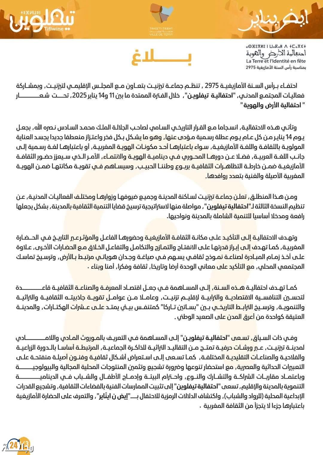 بمناسبة رأس السنة الأمازيغية 2975، تنظم جماعة تيزنيت بتعاون مع المجلس الإقليمي لتيزنيت وبدعم من المجتمع المدني، احتفالية “تيفلوين” من 11 إلى 14 يناير 2025. تأتي هذه الفعالية تحت شعار احتفالية الأرض والهوية ، في إطار قرار ملكي تاريخي يحدد يوم 14 يناير عطلة رسمية، مما يعكس التقدير الكبير للثقافة واللغة الأمازيغية كجزء أساسي من الهوية المغربية.