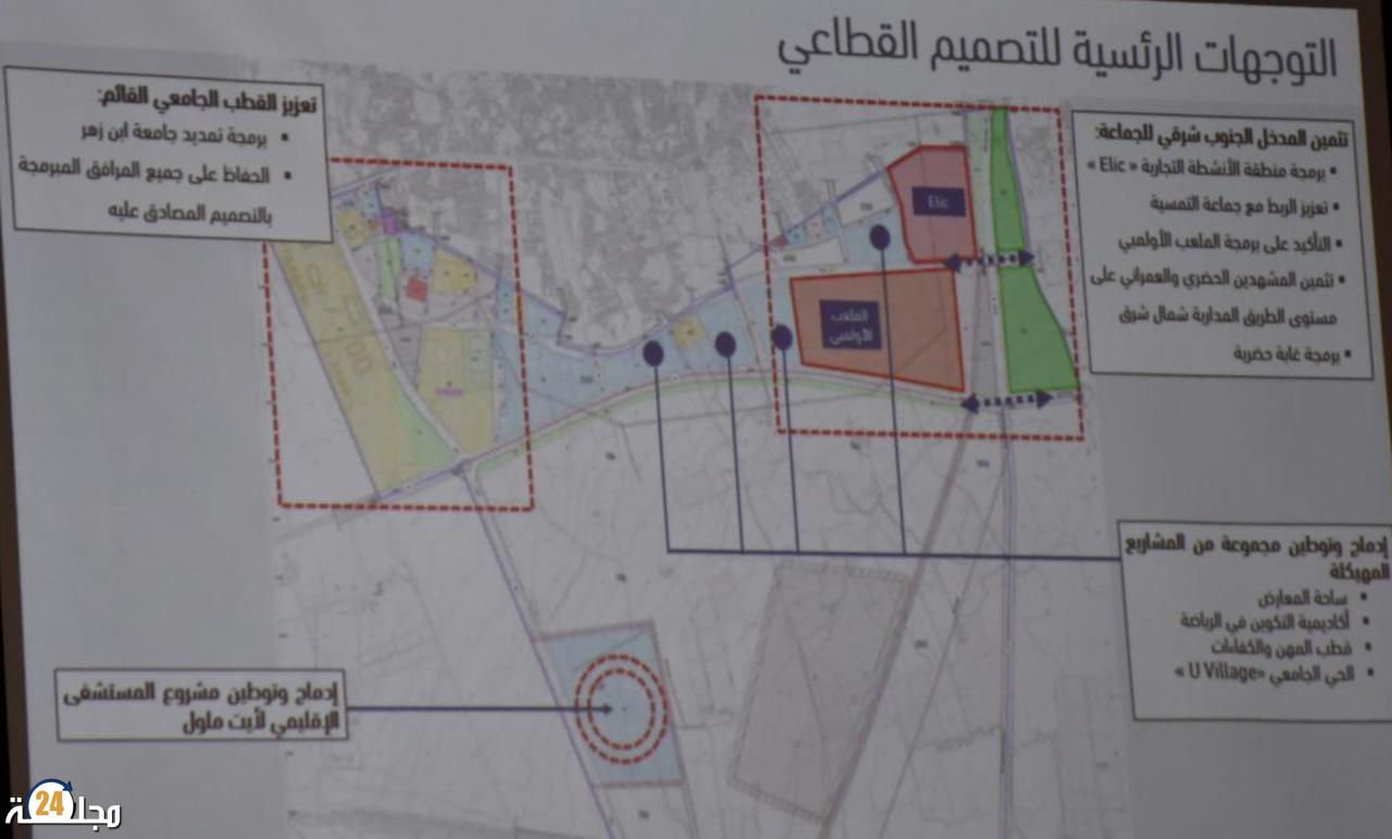 وكان عرض السيدة المشرفة على الدراسة مفصلاً، حيث تناولت فيه مختلف جوانب المشروع، من بينها برمجة منطقة الأنشطة التجارية واللوجيستية، وملعب أولمبي لتعزيز الجاذبية الرياضية للمدينة. كما تطرقت إلى مشاريع أخرى مثل المعرض الدائم وأكاديمية التكوين في الرياضة، والحي الجامعي بمواصفات عالمية.