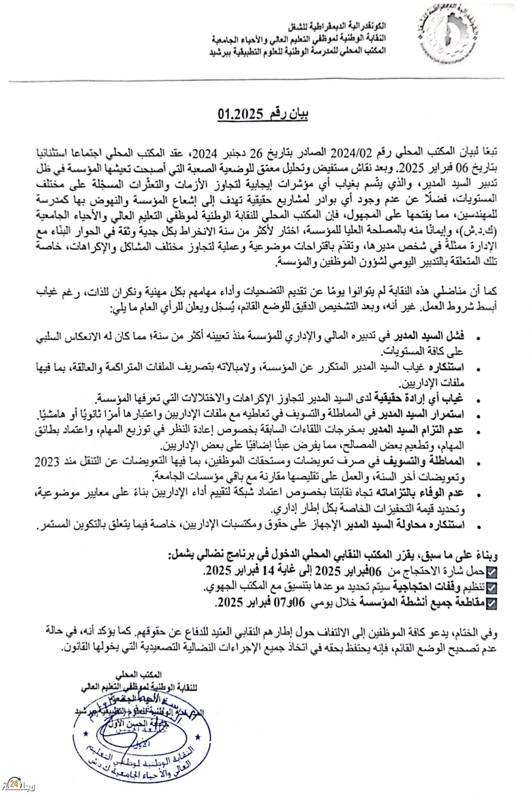 تعلن النقابة الوطنية لمستخدمي التعليم العالي والبحث العلمي، المكتب المحلي للمدرسة الوطنية للعلوم التطبيقية ببرشيد، في بيانها رقم 01.2025، عن تنظيم اجتماع استثنائي يوم 26 ديسمبر 2024.