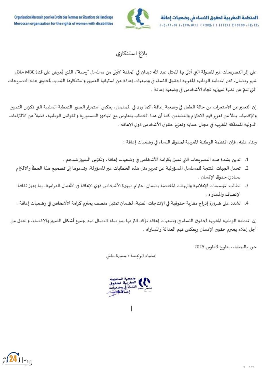 في خطوة تعكس رفضها للتمييز والإقصاء، أصدرت المنظمة الوطنية المغربية لحقوق النساء في وضعيات إعاقة بلاغا استنكاريا ضد التصريحات الواردة في الحلقة الأولى من مسلسل “رحمة”، الذي يعرض على قناة MBC خلال شهر رمضان.