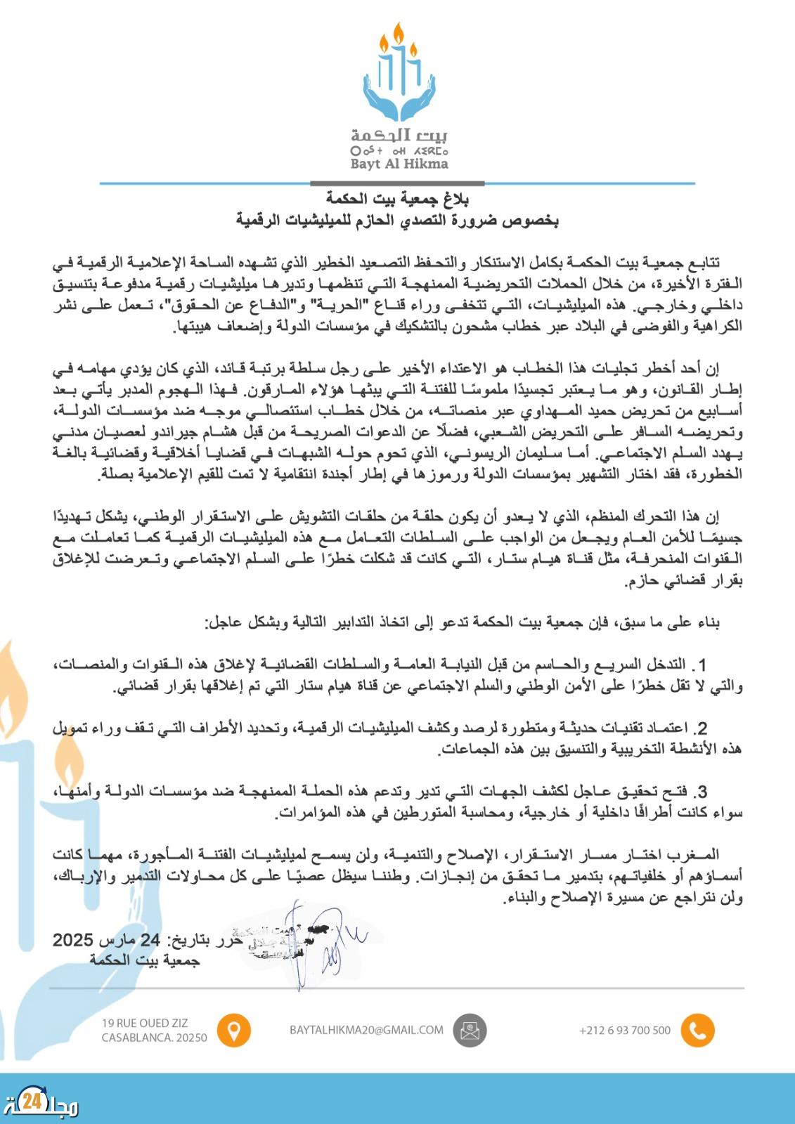 بــلاغ جــمــعـيـة بــيــت الــحــكــمــة بخصوص ضرورة التصدي الحازم للميليشيات الرقمية