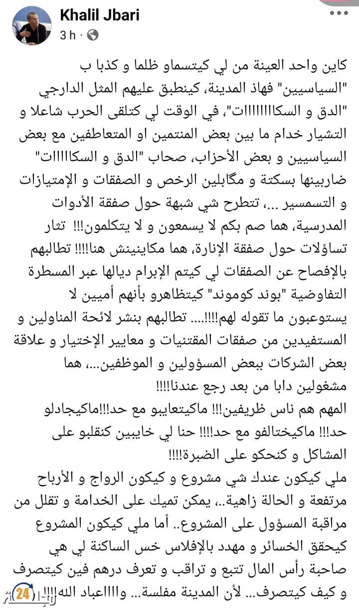 المستشار الجماعي الخليل الجباري من المعارضة أطلق مؤخراً نداء استفهامياً مشفوعاً برسائل سياسية قوية، منتقداً ما وصفه بـ”التواطؤ بالصمت” إزاء ما يثار من شبهات حول تدبير صفقات كصفقة الأدوات المدرسية، وصفقة الإنارة العمومية، وكذا ما يتعلق بالصفقات التفاوضية المعروفة بـ”البوند كوموند”.