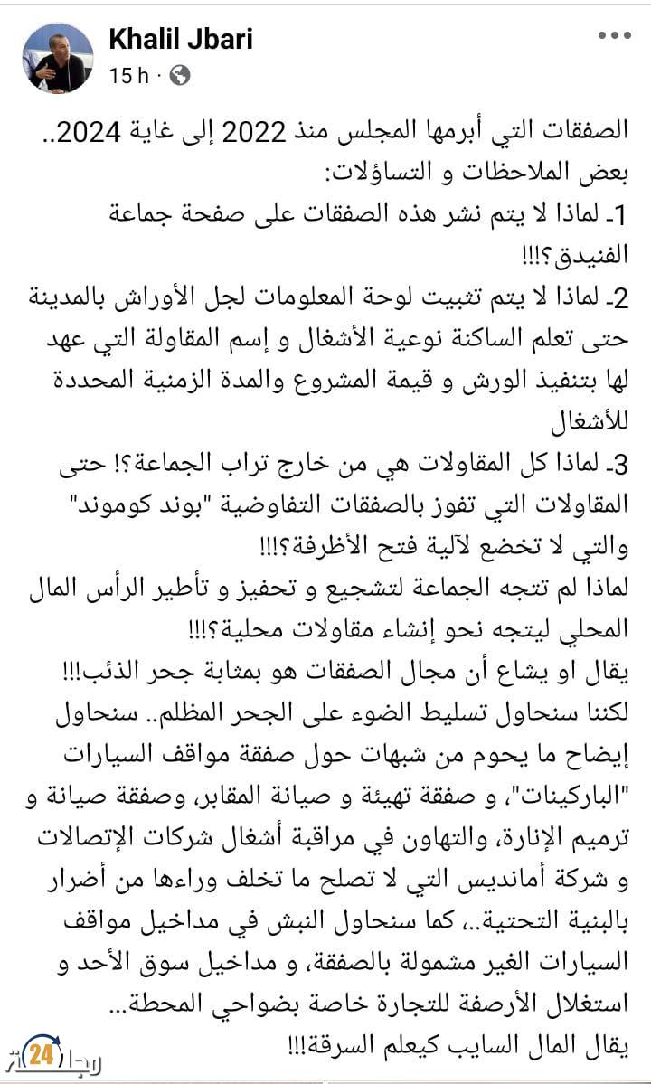 في خطوة تنم عن جرأة سياسية وغيرة على المال العام، خرج مستشار المعارضة بجماعة الفنيدق، خليل الجباري، ليفتح ملفاً ساخناً حول الصفقات العمومية التي أبرمها المجلس الجماعي للمدينة منذ سنة 2022 إلى حدود سنة 2024، موجهاً جملة من التساؤلات التي تعكس قلقاً مشروعاً لدى الرأي العام المحلي، وتسليطاً للضوء على غياب الشفافية في تدبير الشأن المحلي.