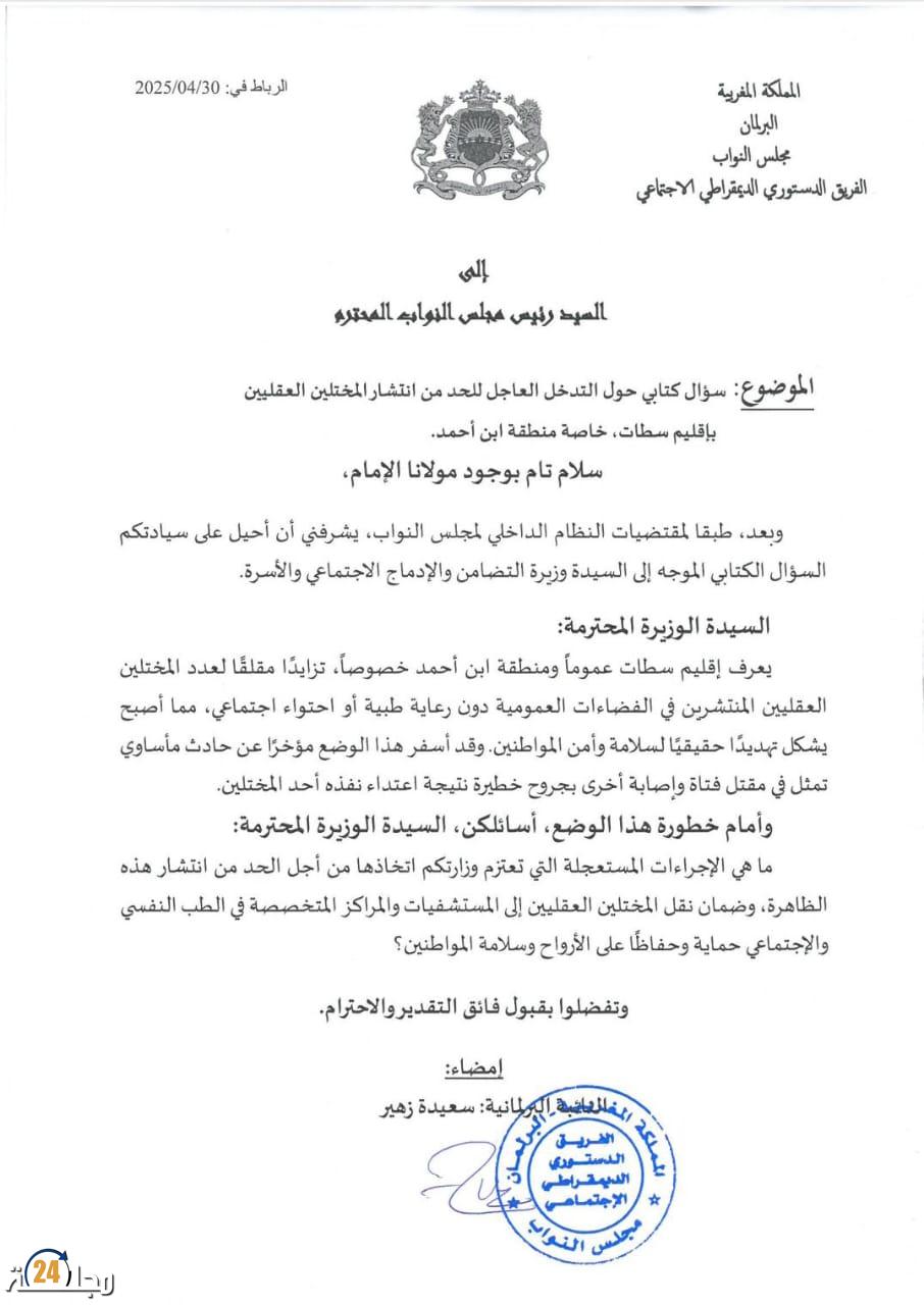 النائبة شددت على أن هذه الظاهرة لم تعد تقتصر على الحالات الفردية المعزولة، بل باتت تمثل مصدر خطر حقيقي على الساكنة، في ظل غياب تدابير وقائية واستباقية، وعدم تخصيص مؤسسات للرعاية والمتابعة الطبية والنفسية لهؤلاء الأشخاص.