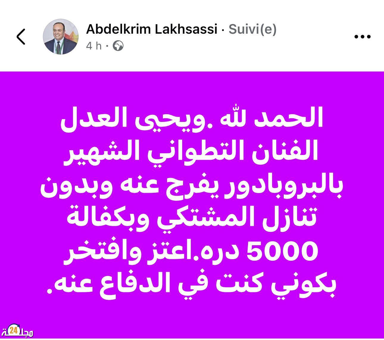 ورغم أن التهمة الموجهة إليه تظل بسيطة وتتعلق بـ”التشهير” فإن الفنان Probador أصر على متابعة القضية وفق المساطر القانونية مؤكدًا أنه لن يتنازل عن حقه في الإنصاف وجبر الضرر.