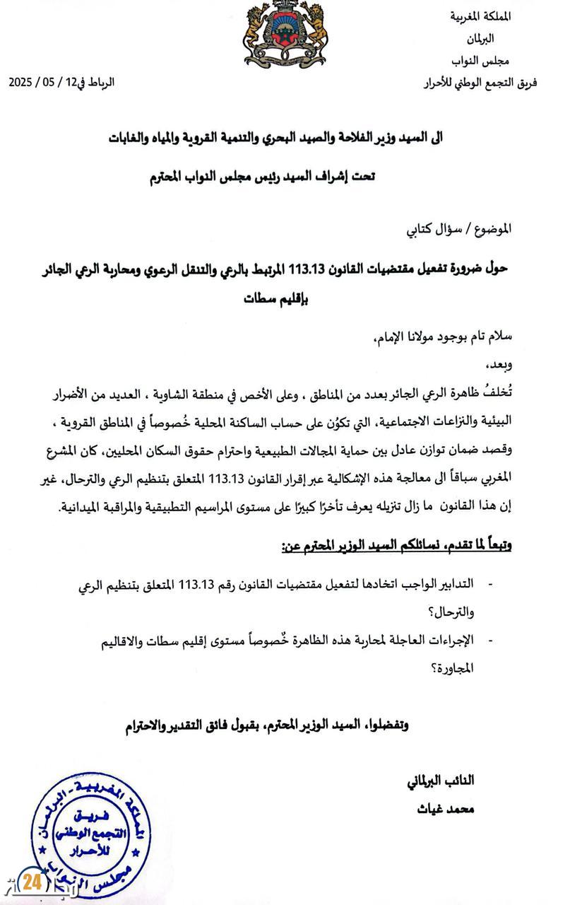 وجّه النائب البرلماني محمد غياث، عضو فريق التجمع الوطني للأحرار بمجلس النواب، سؤالًا كتابيًا إلى وزير الفلاحة والصيد البحري والتنمية القروية والمياه والغابات، حول ضرورة تفعيل مقتضيات القانون رقم 113.13 المتعلق بتنظيم الرعي والترحال، وذلك على خلفية تصاعد ظاهرة الرعي الجائر في عدد من المناطق، لاسيما بإقليم سطات.