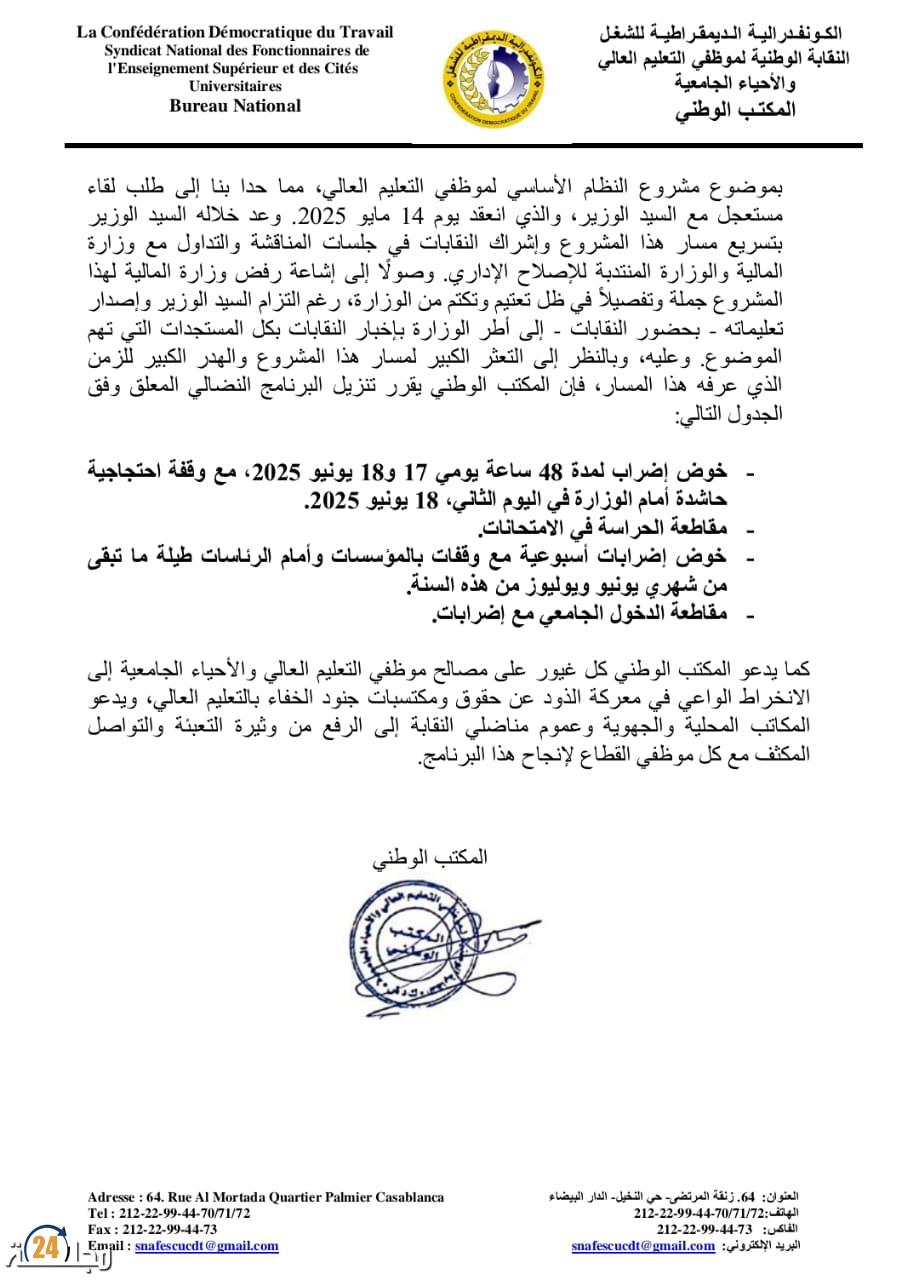 كما تضمّن البرنامج النضالي، حسب بلاغ سابق للنقابة، إضرابات أسبوعية، ومقاطعة الحراسة في الامتحانات، ومقاطعة الدخول الجامعي المقبل، في حال استمرار تجاهل المطالب وعدم الاستجابة لمضامين الملف المطلبي المشروع.