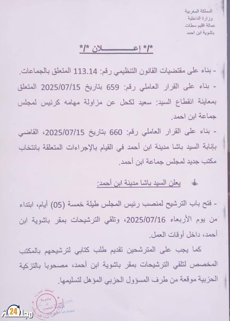 وحسب الإعلان الصادر عن باشوية ابن أحمد، الذي توصلت الجريدة بنسخة منه، فإن قرار فتح باب الترشيح جاء بناءً على القانون التنظيمي رقم 113.14 المتعلق بالجماعات، وبناءً على قرار عامل إقليم سطات رقم 659 بتاريخ 15 يوليوز 2025 القاضي بمعاينة انقطاع سعيد لكحل عن ممارسة مهامه كرئيس لمجلس جماعة ابن أحمد.