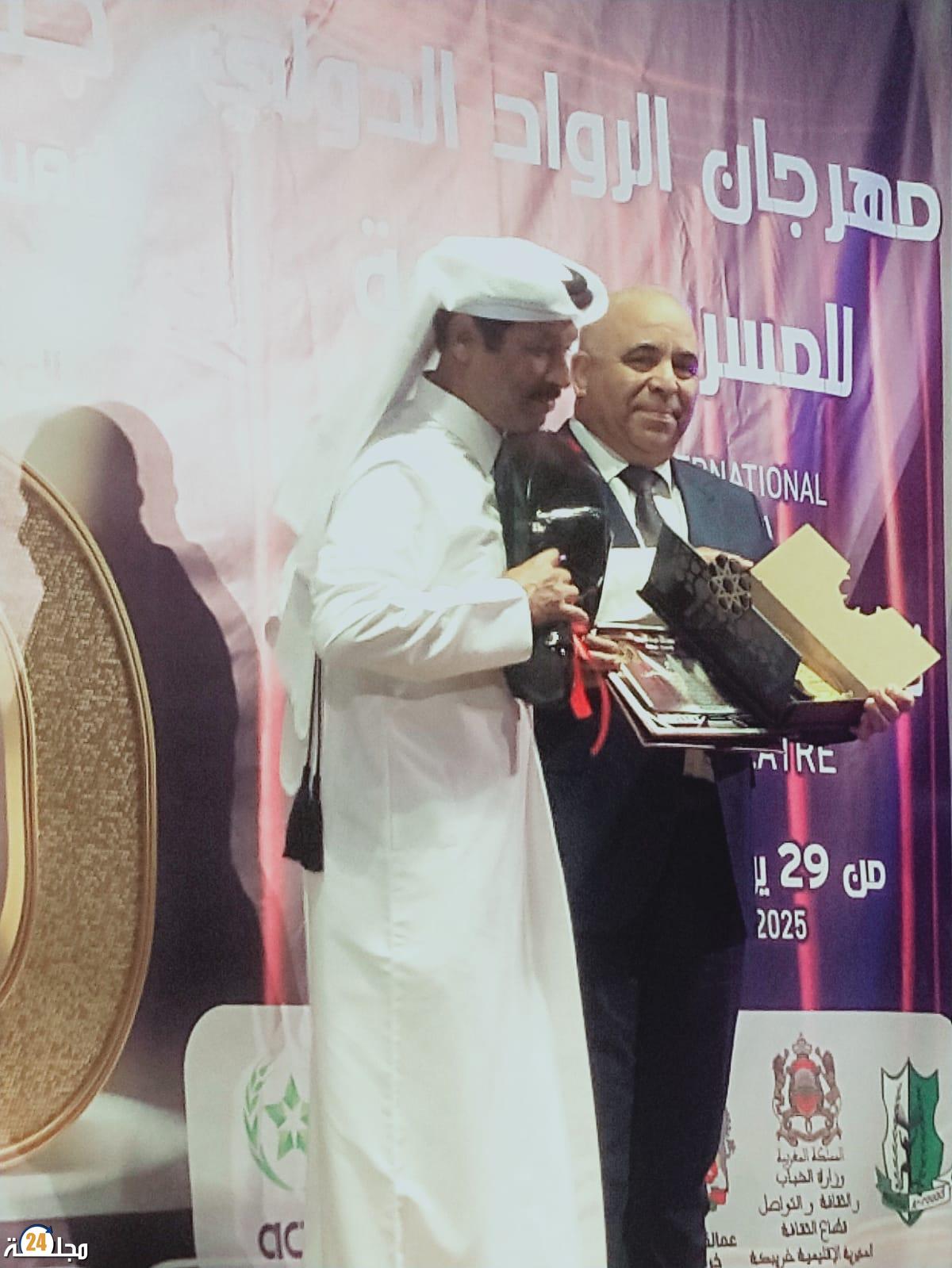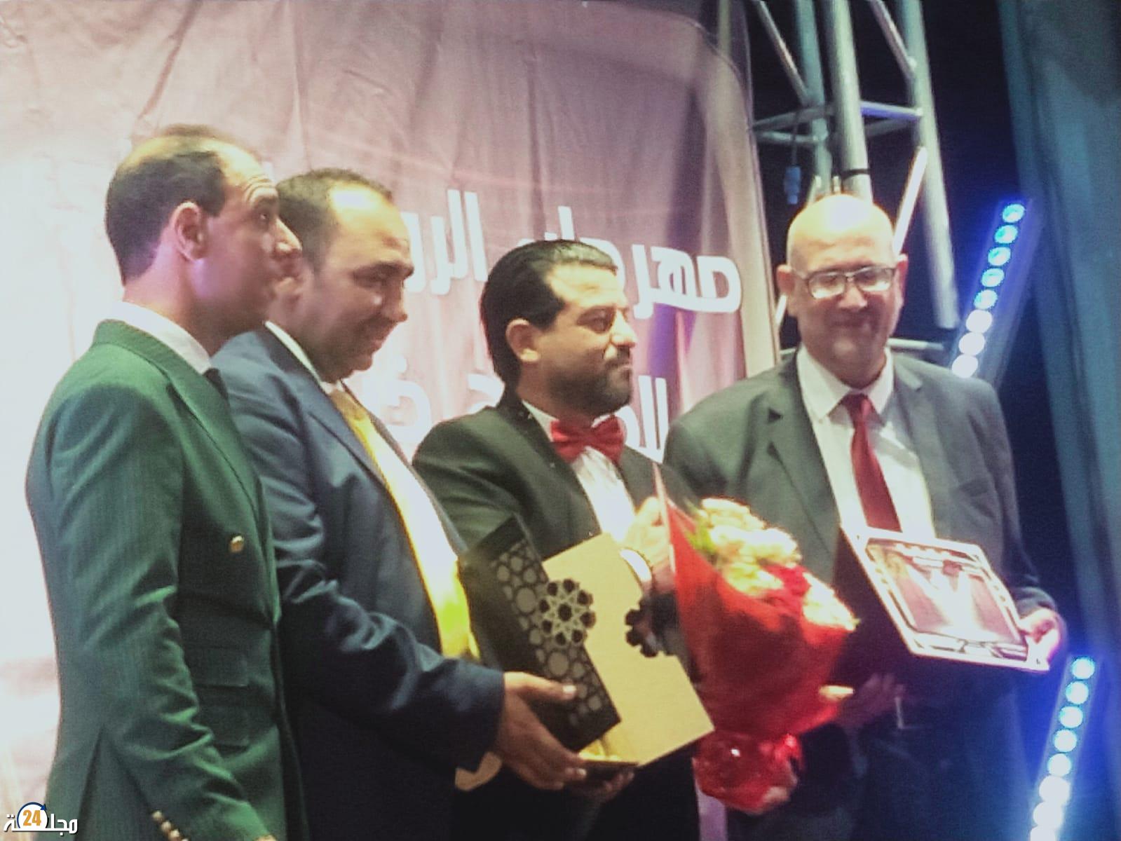 السيد عبد الجليل جعداوي نائب رئيس المجلس الترابي لخريبكة وتقدم السيد عبد الغاني الشرقاوي نائب رئيس غرفة التجارة والصناعة والخدمات لجهة بني ملال خنيفرة ملحقة خريبكة ليسلم شهادة التكريم للمكرم