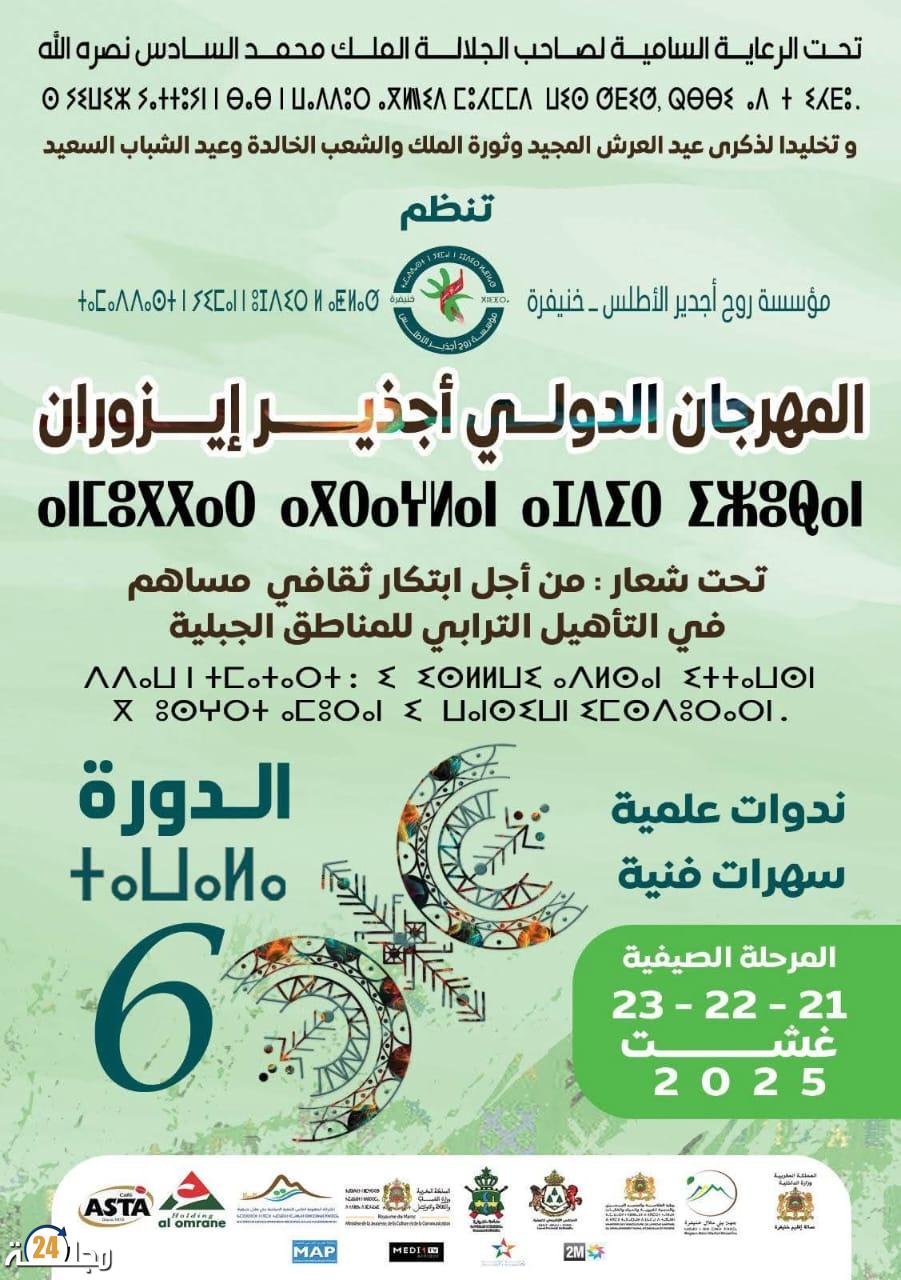 تحت الرعاية السامية لصاحب الجلالة الملك محمد السادس نصره الله، تنظم مؤسسة روح أجدير الأطلس بخنيفرة بشراكة مع مؤسسات وطنية وجهوية ومحلية،الدورة السادسة للمهرجان الدولي أجدير إيزوران، تحت شعار: