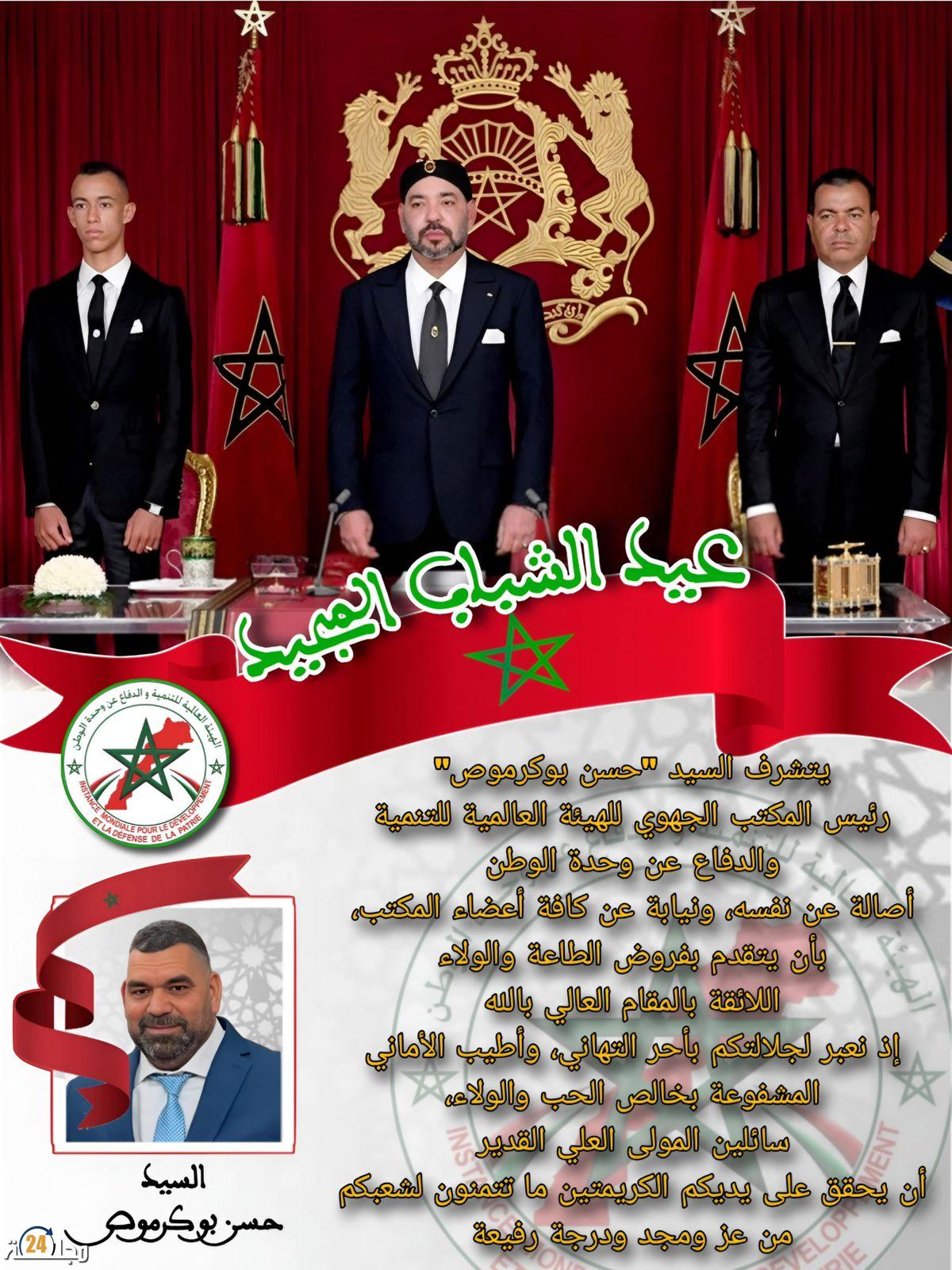 بمناسبة الذكرى المجيدة لثورة الملك والشعب في 20 غشت، والاحتفال بعيد الشباب المجيد في 21 غشت، يتشرف السيد حسن بوكـرموص، رئيس المكتب الجهوي للهيئة العالمية للتنمية والدفاع عن وحدة الوطن بجهة طنجة تطوان الحسيمة، أصالة عن نفسه ونيابة عن كافة أعضاء المكتب، بأن يرفع إلى المقام العالي بالله أسمى آيات الولاء والإخلاص، وأحر التهاني وأصدق المتمنيات المشفوعة بخالص المحبة والوفاء.