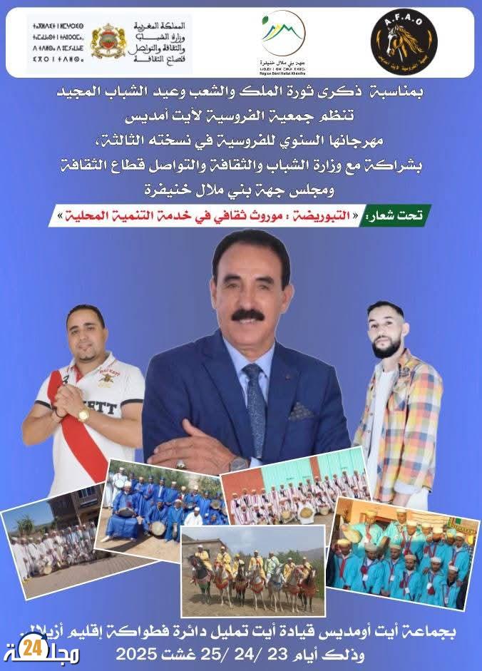 بمناسبة ذكرى ثورة الملك و الشعب و عيد الشباب تنظم جمعية الفروسية ايت اومديس بدعم من وزارة الشباب و الثقافة و التواصل قطاع الثقافة و مجلس جهة بني ملال خنيفرة مهرجانها السنوي للفروسية في نسخته الثالثة تحت شعار التبوريدة موروث ثقافي في خدمة التنمية المحلية.