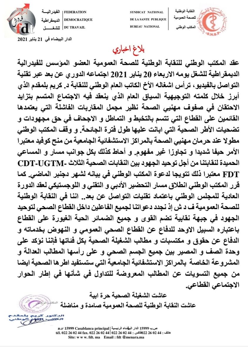 بلاغ الفيدرالية الديموقراطية للشغل 22 يناير، 2021 0 من الوطن Facebook Whatsapp Twitter طباعة مجلة 24/بلاغ ناقش المكتب الوطني للنقابة الوطنية للصحة العمومية بشكل خاص، حرمان مهنيي الصحة من منح كوفيد19، واصفا إياه بالحيف الشديد، التفاصيل في نص البلاغ: Post Views: 132 #بلاغ الفيدرالية الديموقراطية للشغل
