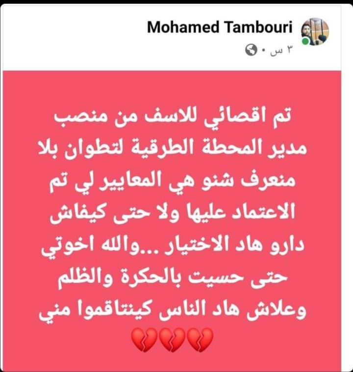 و قد حاول محمد الطنبوري من خلال تدوينته أن ينقل للرأي العام ما يحسه من ظلم و حكرة بعد أن تم إقصائه بشكل متعمد من شغل وظيفة مدير المحطة الطرقية تطوان فالسيرة الذاتية و الشواهد الجامعية الحاصل عليها بالإضافة إلى التجربة التي إكتسبها و هو مستخدم بالمحطة الطرقية تجعلانه المرشح الأقوى لشغل هذا المنصب مضيفا أن جهات تسعى إلى الإنتقام منه.