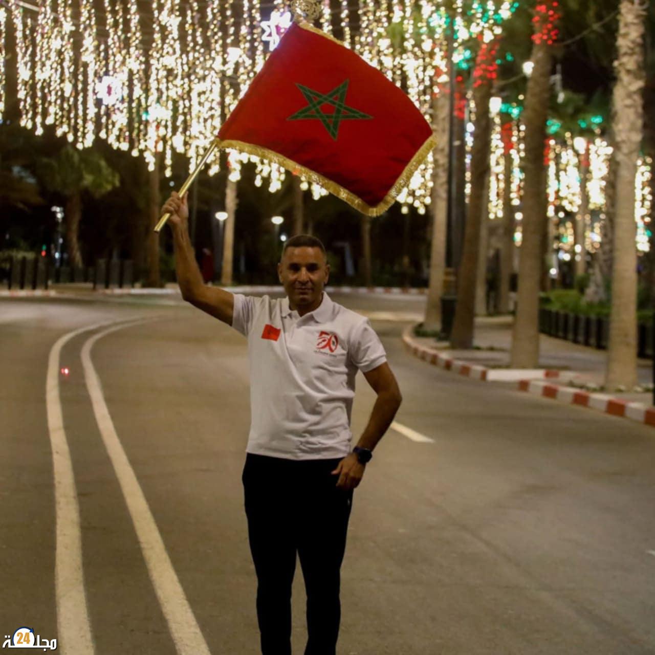 سباق التناوب الرمزي المسيرة الخضراء : إبراهيم لحلافي يحمل العلم الوطني في المرحلة 13 ( العيون- بوجدور)