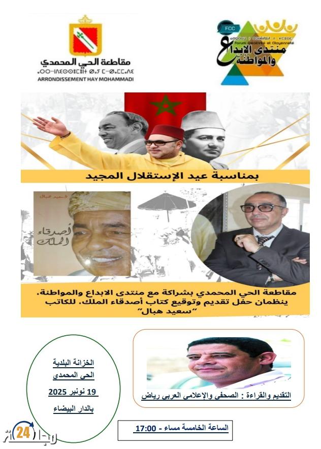 بمناسبة ذكرى عيد الاستقلال المجيد (18 نونبر)، ينظم منتدى الإبداع والمواطنة، بشراكة مع مقاطعة الحي المحمدي بالدار البيضاء، حفل تقديم وتوقيع كتاب “أصدقاء الملك” للكاتب والمؤلف الدكتور سعيد هبال.