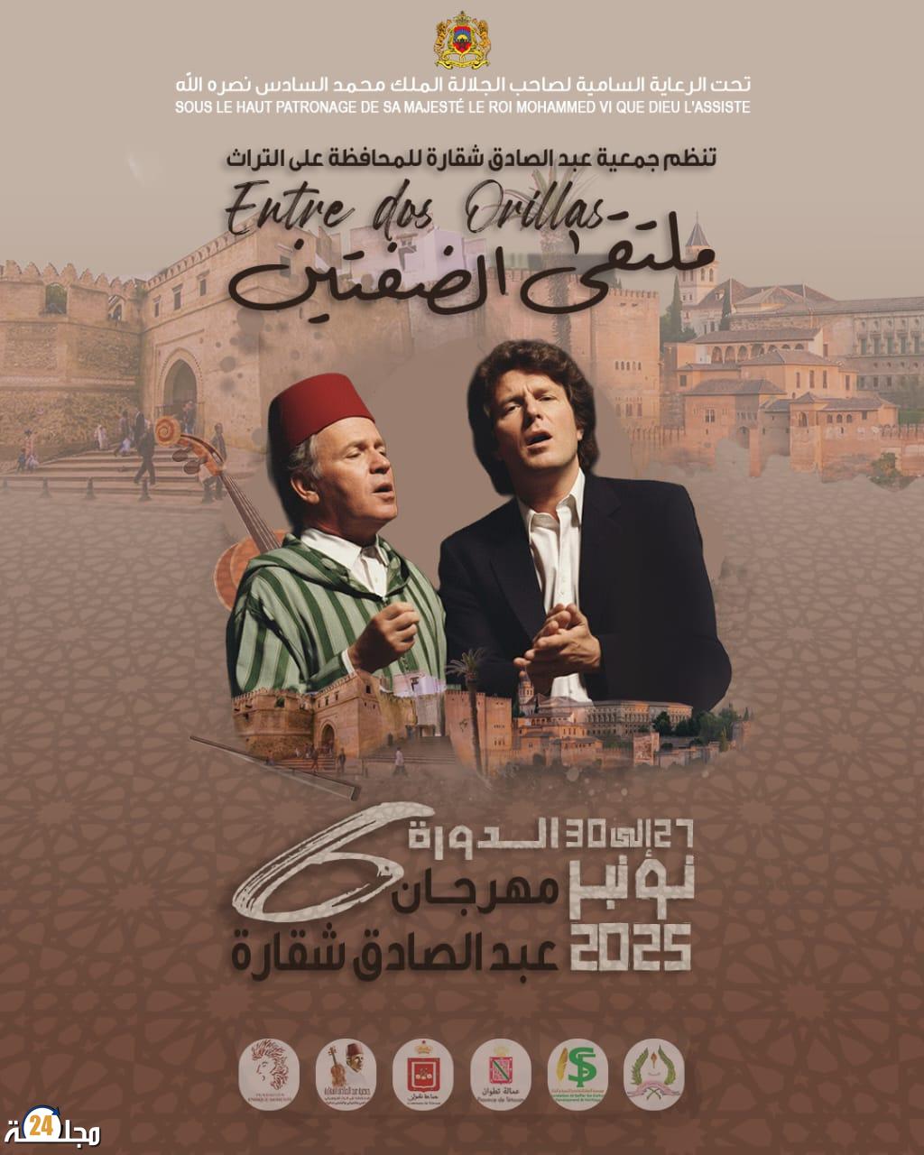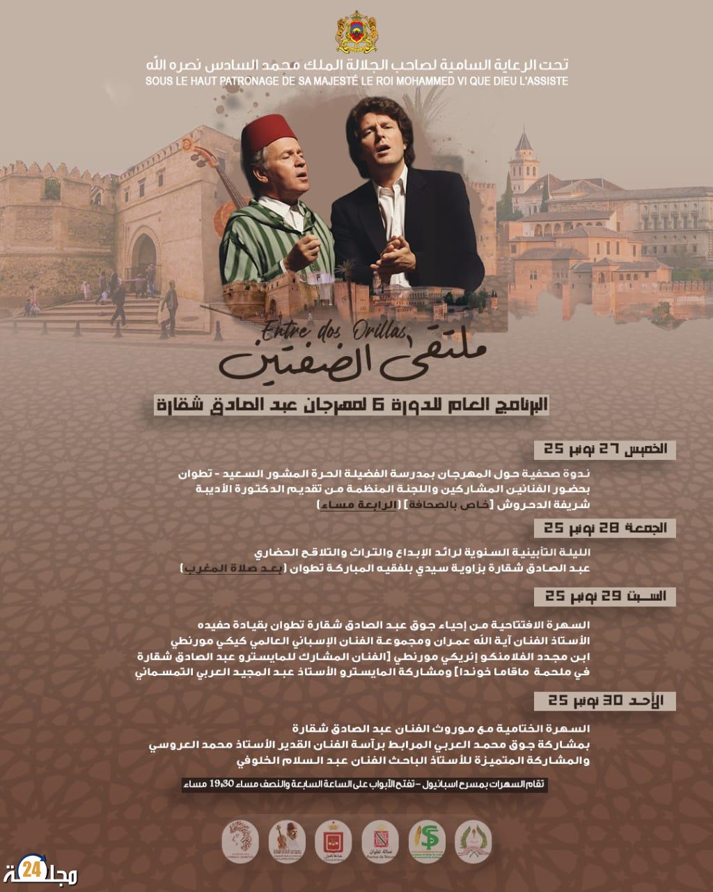 في إطار الدينامية الثقافية الهادفة إلى ترسيخ مكانة مدينة تطوان كعاصمة للثقافة والحوار بالبحر الأبيض المتوسّط، تنظم جمعية عبد الصادق شقارة الدورة السادسة لمهرجان عبد الصادق شقارة تحت شعار ملتقى الضفتين “Entre dos Orillas”، وذلك خلال الفترة الممتدة من 27 إلى 30 نونبر 2025، تحت الرعاية السامية لصاحب الجلالة الملك محمد السادس نصره الله.