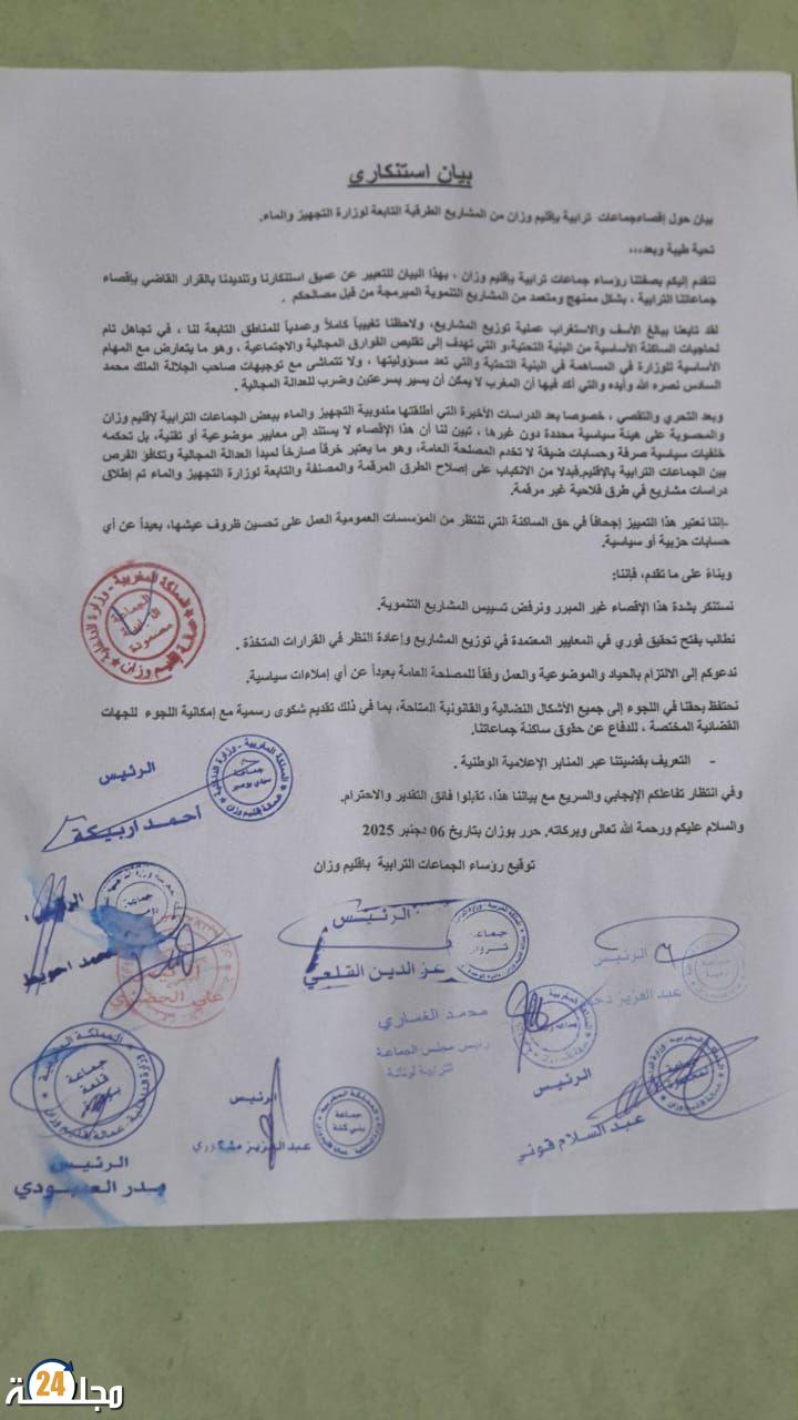 رؤساء الجماعات الموقّعون على البيان يؤكدون أن الحيف بلغ مداه، وأن جماعاتهم تعرّضت لإقصاء غير مفهوم، رغم أنها الأكثر تضرراً من تدهور البنية الطرقية وغياب المسالك التي تربط الدواوير بالمراكز الحيوية.