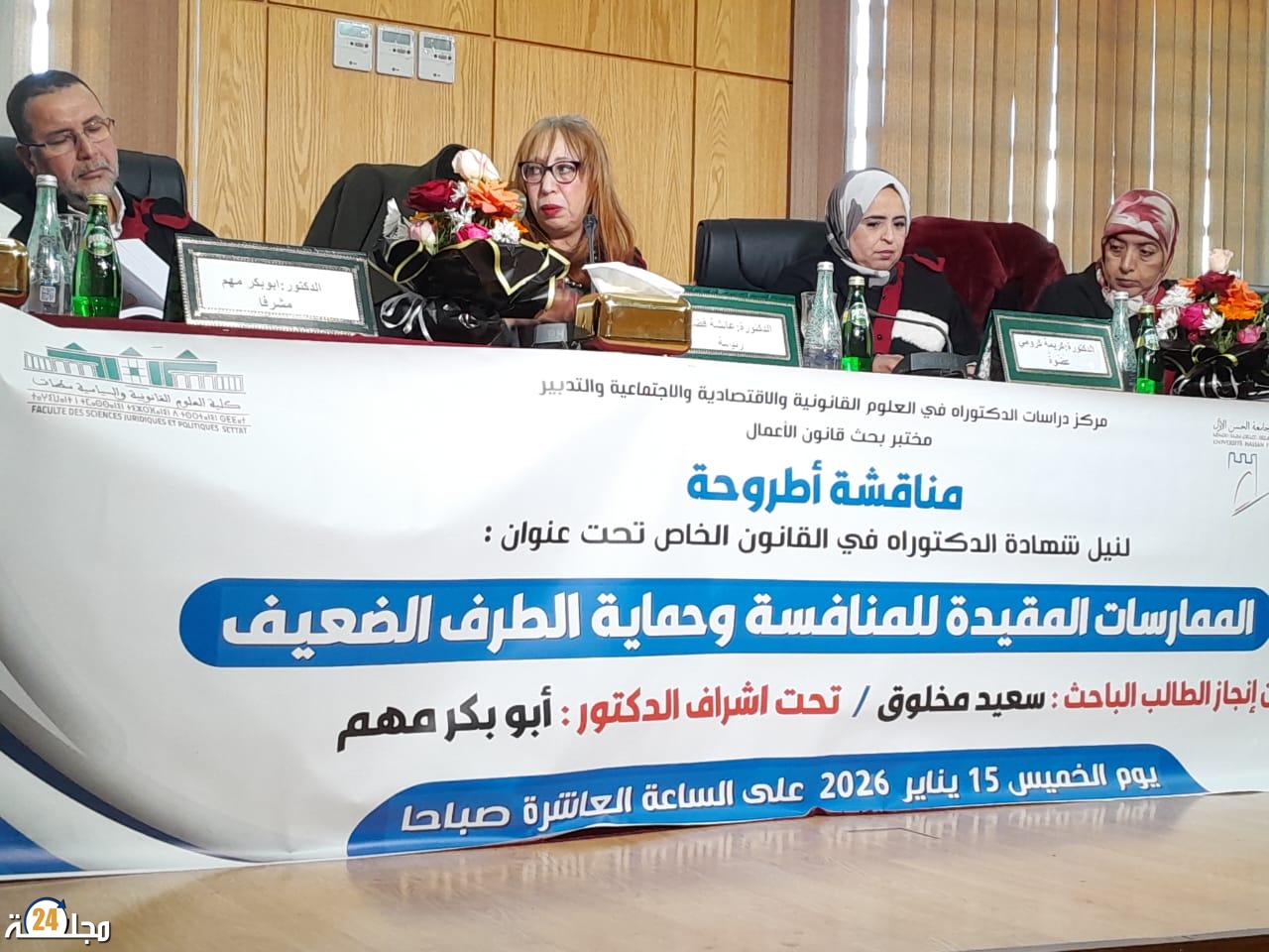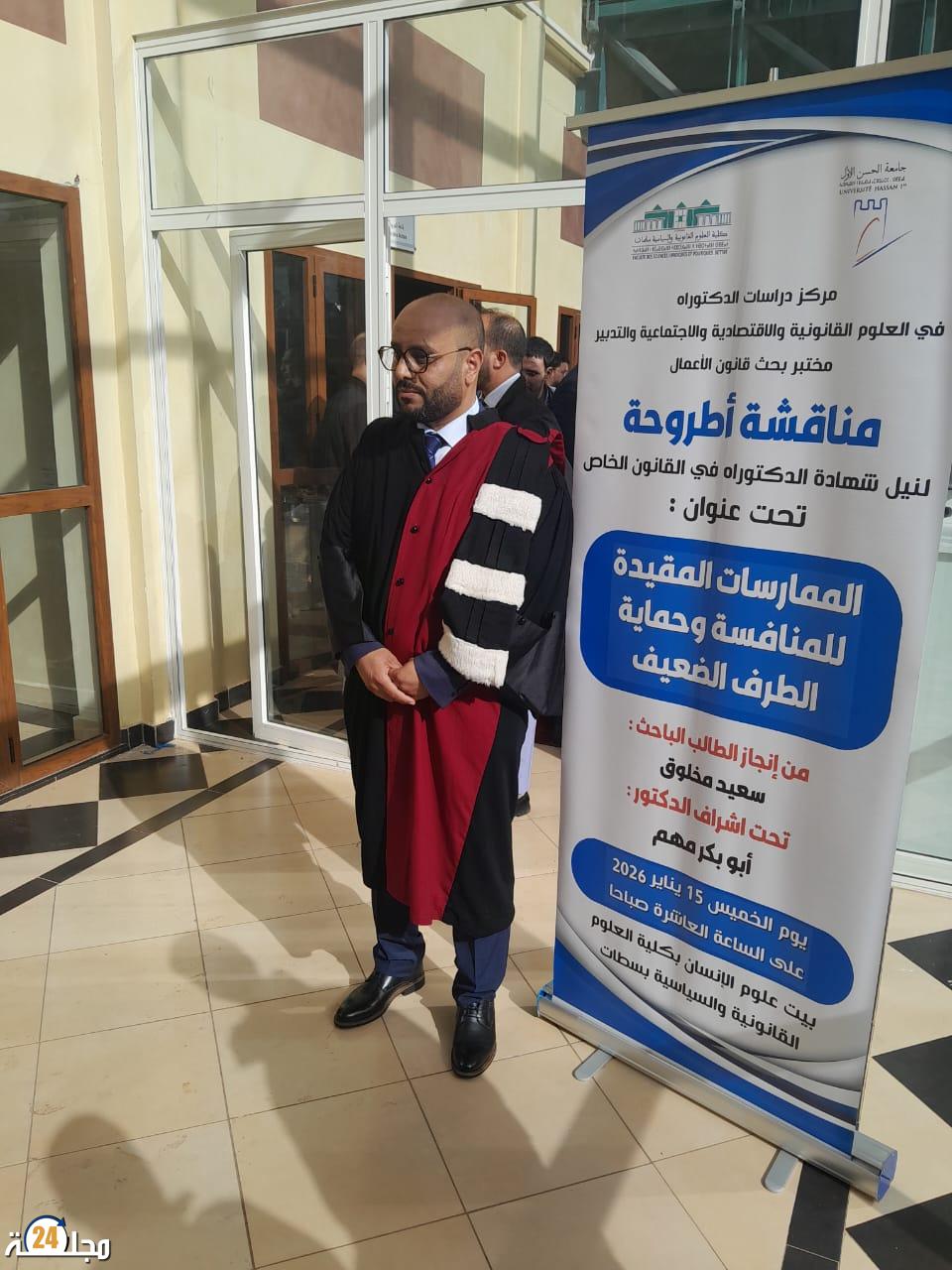 شهدت قاعة المناقشات بكلية العلوم القانونية والسياسية بجامعة الحسن الأول بسطات، يومه الخميس 15 يناير 2026، عرسًا أكاديميًا استثنائيًا، حيث نجح الطالب الباحث سعيد مخلوق في الدفاع عن أطروحته لنيل الدكتوراه في القانون الخاص، والتي أنجزت تحت التأطير العلمي الرصين لفضيلة الدكتور أبوبكر مهم.