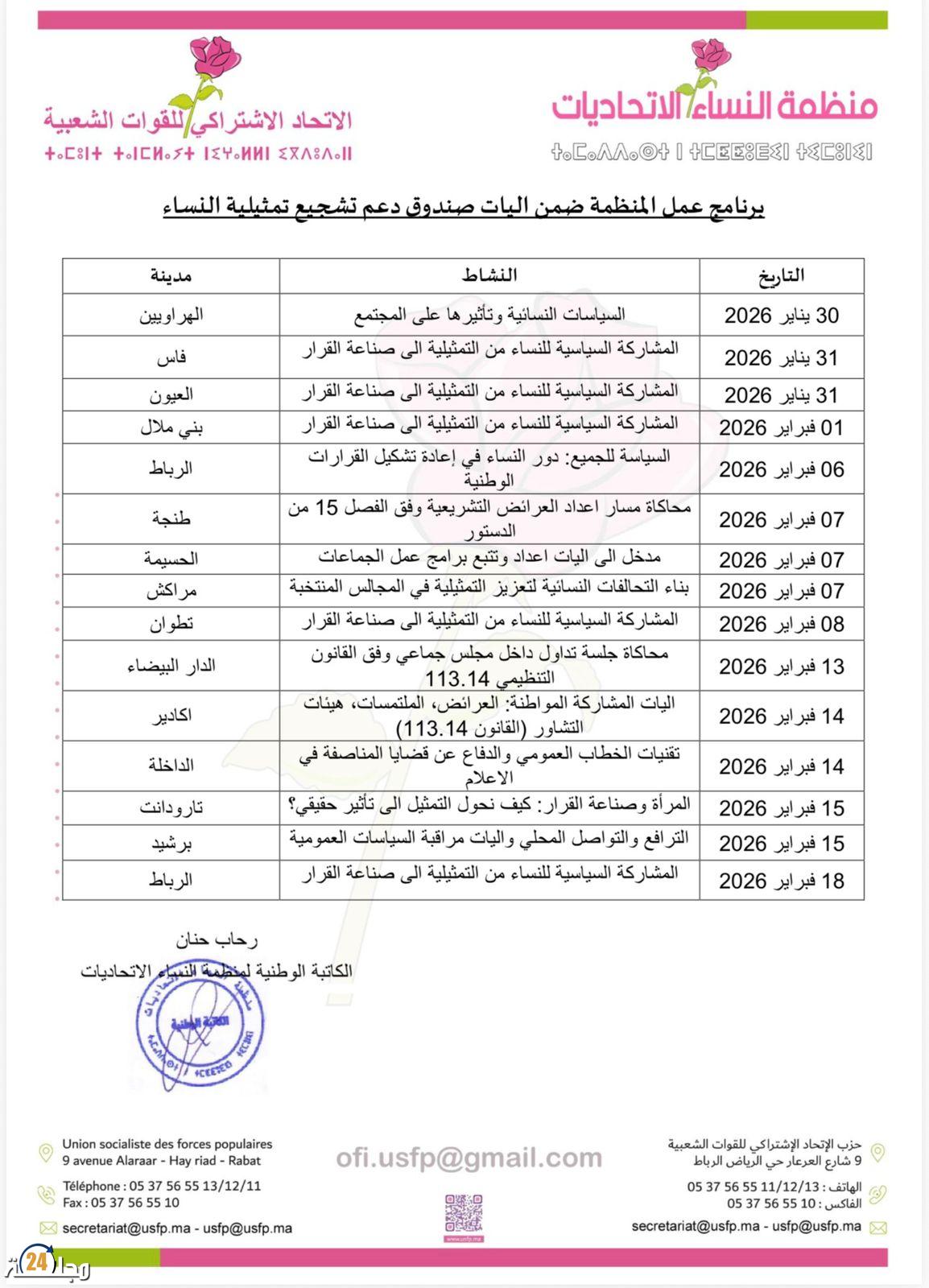 أطلقت منظمة النساء الاتحاديات، بشراكة مع صندوق الدعم لتشجيع تمثلية النساء التابع لوزارة الداخلية، سلسلة من اللقاءات التأطيرية والتكوينية في إطار مشروع «المشاركة السياسية للنساء: من التمثيلية إلى صناعة القرار»، والتي انطلقت في 30 يناير وتمتد إلى غاية 18 فبراير 2026، بعدد من المدن المغربية، بهدف تعزيز المشاركة السياسية للنساء وتقوية حضورهن في مواقع التأثير وصناعة القرار.