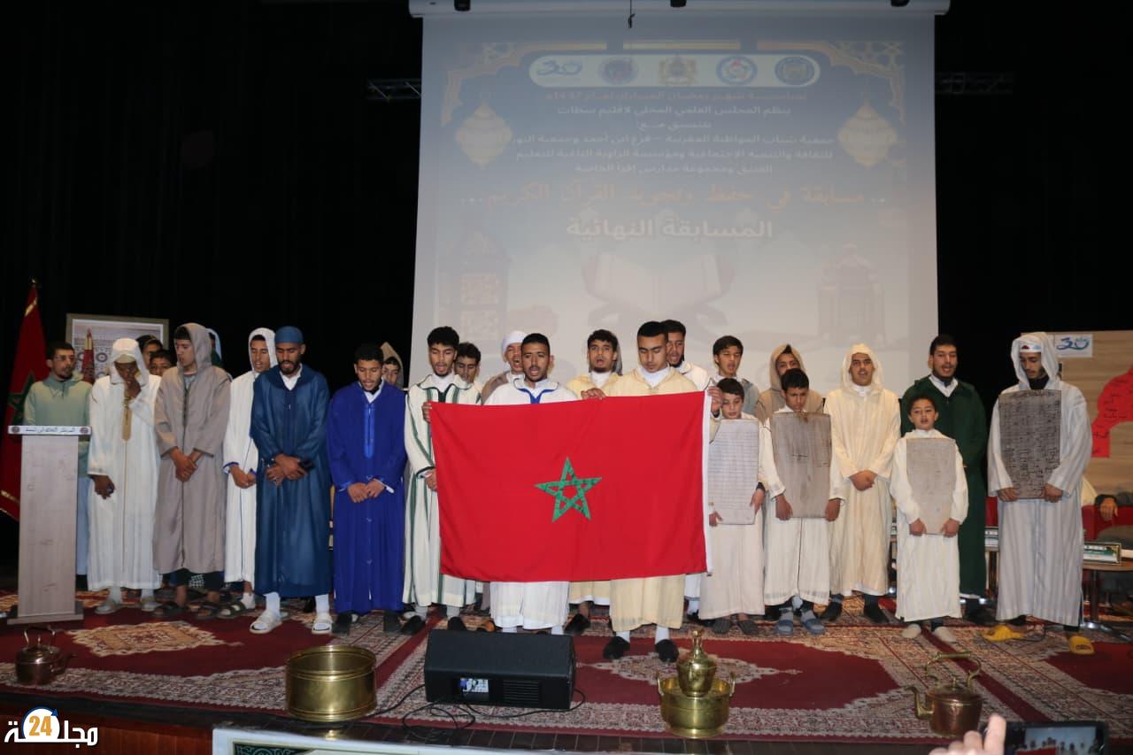 نظم المجلس العلمي المحلي بإقليم سطات بمناسبة شهر رمضان المبارك لعام 1447هـ، الموافق لـ 12 مارس 2026، محفلا قرآنيا بهيجاً ومسابقة نهائية كبرى في حفظ وتجويد القرآن الكريم، في أجواء إيمانية مفعمة بالروحانية والخشوع والسكينة. وقد جاء هذا العرس الرباني بتنسيق وتعاون مثمر عكس روح التضامن المؤسساتي، بمشاركة فعالة من جمعية شباب المواطنة المغربية فرع ابن أحمد، وجمعية النور للثقافة والتنمية الاجتماعية، ومؤسسة الزاوية التاغية للتعليم العتيق، بالإضافة إلى مجموعة مدارس اقرأ الخاصة.