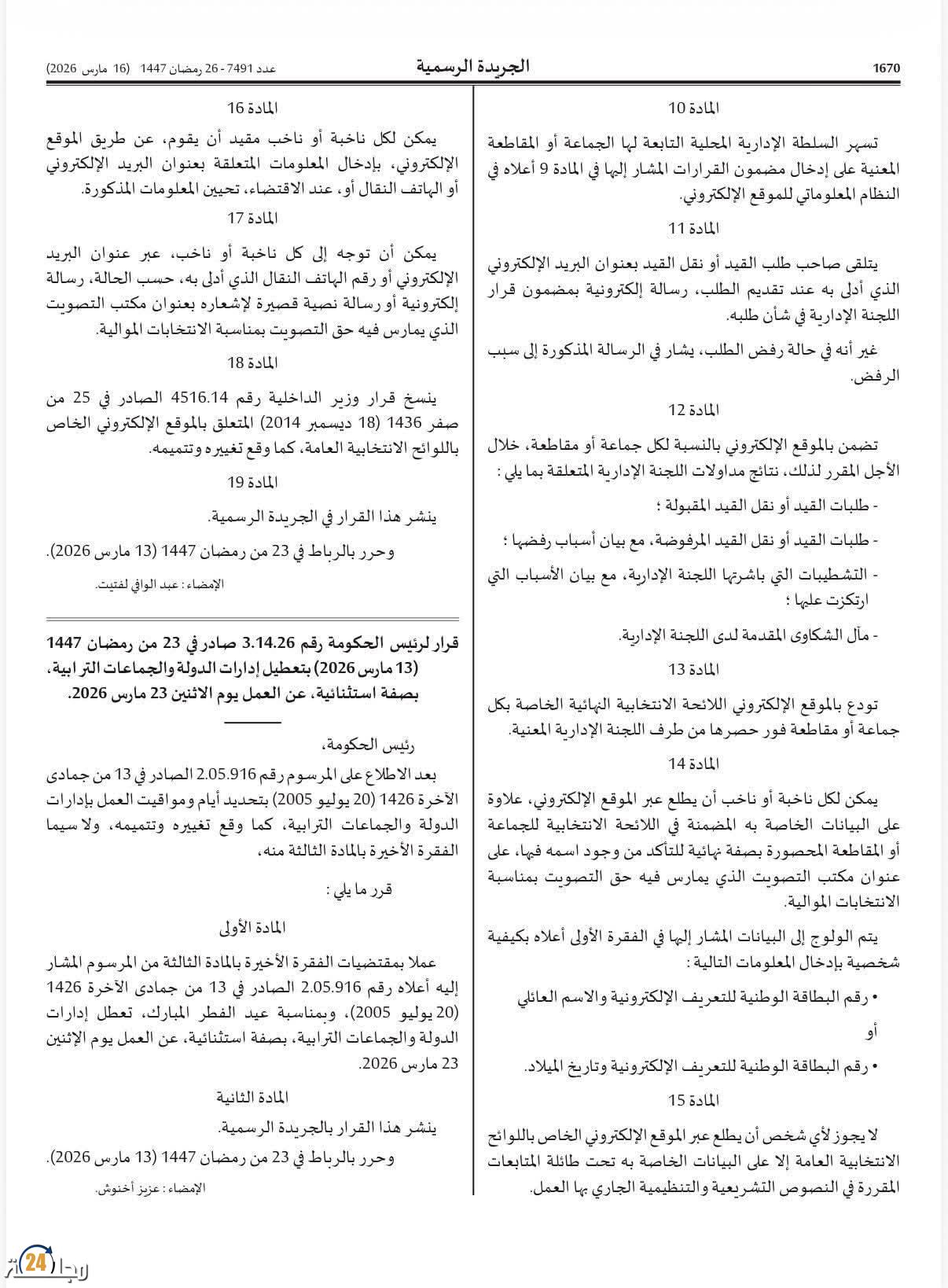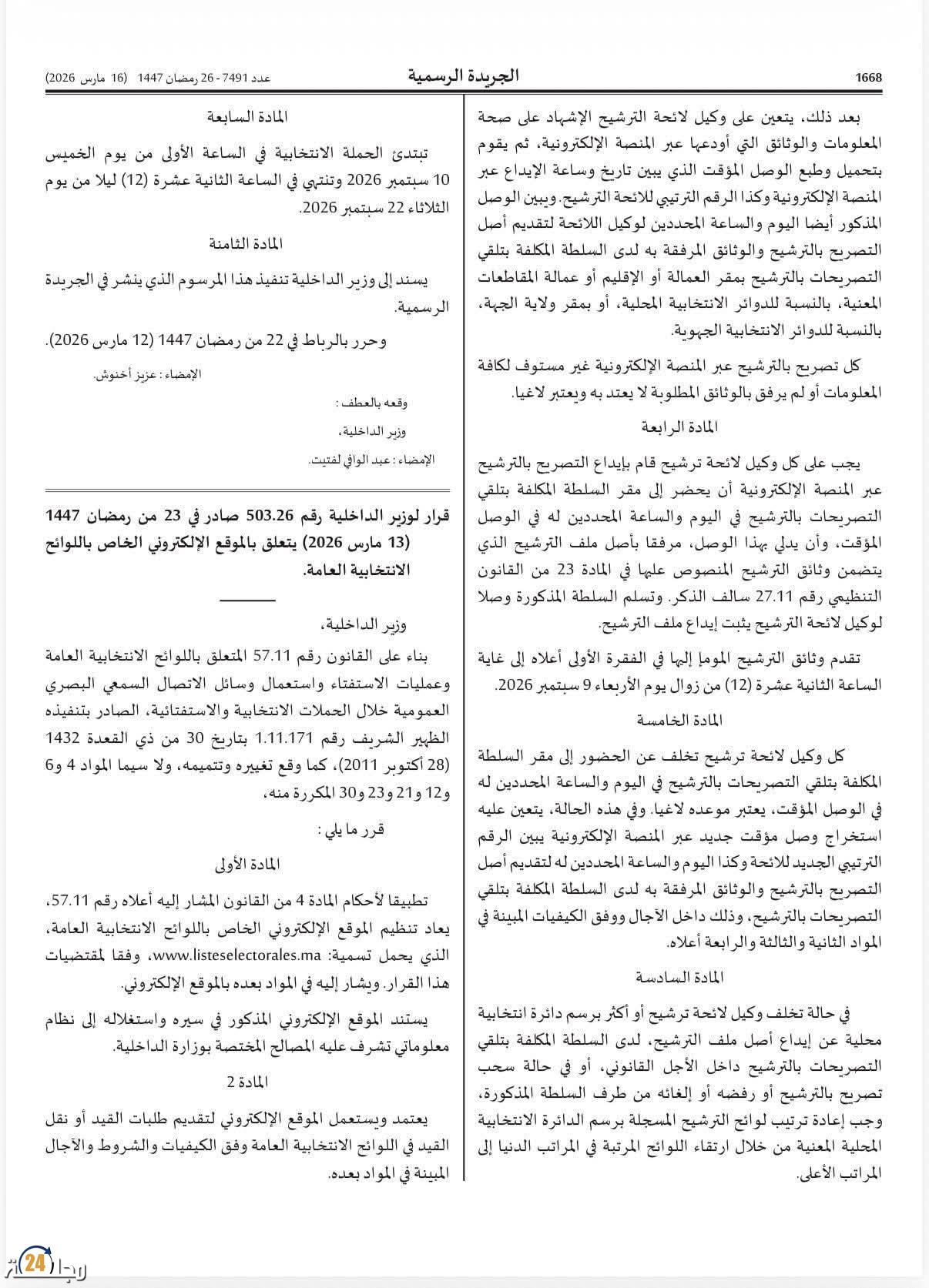 تُعد اللحظة الانتخابية في النظم الديمقراطية المعاصرة ممارسةً سيادية بامتياز، لا تقتصر وظيفتها على اختيار الفاعلين السياسيين فحسب، بل تمتد لتكون مرآة تعكس نضج المؤسسات وقدرتها على التكيف مع التحولات المجتمعية والتقنية. وفي المغرب، يأتي صدور العدد 7491 من الجريدة الرسمية (16 مارس 2026) ليضع اللبنات الإجرائية والزمنية للاستحقاقات التشريعية المقبلة، من خلال حزمة من المراسيم والقرارات السيادية التي ترسم ملامح المشهد السياسي لعام 2026. إن قراءة متأنية وفاحصة في “المرسوم رقم 2.26.190″ و”القرار رقم 503.26” تكشف عن تحول جذري وبنيوي في فلسفة التدبير الانتخابي بالمملكة؛ حيث لم يعد الرهان مقتصرًا على الجانب اللوجيستي والميداني التقليدي، بل انتقل بجرأة نحو مربع “الرقمنة السيادية” وتكريس قيم الحكامة الانتخابية الشاملة.