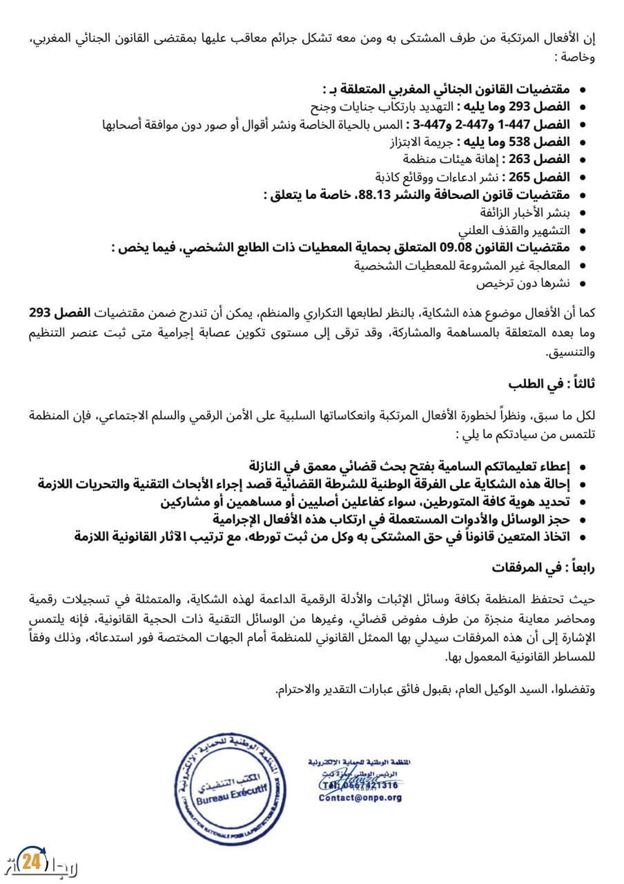 كما استندت الشكاية إلى ترسانة قانونية متعددة، تشمل مقتضيات القانون الجنائي، وقانون الصحافة والنشر، وكذا القانون المتعلق بحماية المعطيات ذات الطابع الشخصي، في تأكيد على شمولية الأفعال المرتكبة وخطورتها.