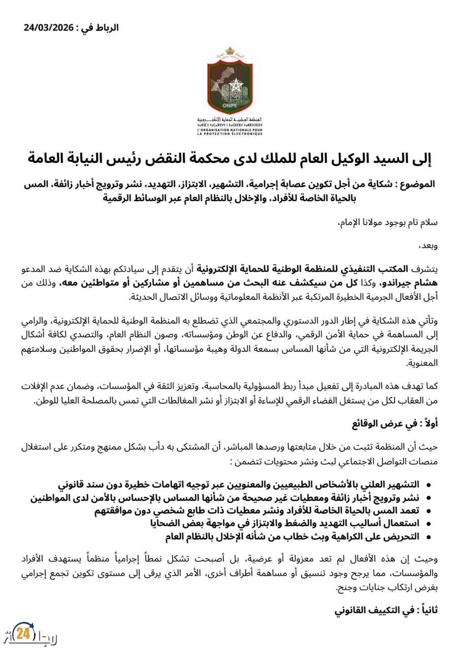 هذه الشكاية، التي وُضعت بتاريخ 24 مارس 2026، تأتي في إطار الدور الدستوري الذي تضطلع به المنظمة، والرامي إلى حماية الأمن الرقمي وصون هيبة المؤسسات، في ظل تصاعد مقلق لظاهرة استغلال الفضاء الرقمي في الإساءة للأفراد والمؤسسات على حد سواء.