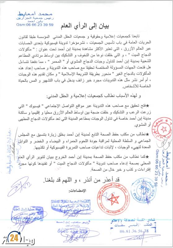بعد الموجة الإخبارية أو التمريرة الفيسبوكية التي تركت ضجة إعلامية كبيرة التي تداولتها ، إحدى الحسابات عبر العالم الأزرق حول ما أصبح يعرف ” بطهي و بيع الدجاج الميت ” بمدينة إبن أحمد و خصوصا بالمحلات المختصة في نوع هذه المأكولات ” اللحوم البيضاء ” و هذا ما أدخل الشكوك في نفسية ساكنة مدينة إبن أحمد و العابرين عبر المحطة الطرقية بالمدينة ، مما دفع مجموعة من الجمعيات الحقوقية و الإعلامية و المدينة ، و بما فيها جمعيات اللحوم ، الى توقيع بيان إستنــــكاري تستنكرن من خلاله بشدة على ما جاءت به تمريرة احد الفايسبوكيين ، و يتساءلون عن صاحب المحل الذي يبيع مثل هذه المأكولات بدجاج غير مذبوح ( شرعا ) بالطريقة الإسلامية و عن صاحب هذا المقال الذي زرع الرعب و الخوف و حالة من الهستيرية و الشكوك بين اوساط سكان مدينة إبن أحمد و المناطق التابعة لها و العابرين و المرتادين على المحطة الطرقية ، و حسب مجموعة من الإرتسامات لجريدة مجلة 24 مع رؤساء بعض الجمعيات الموقعة على هذا البيان أنهم سيوافقون ، لجمعية منهن قانونيا لتبني هذا الملف لوضع شكاية أمام السيد وكيل جلالة الملك لذى إبتدائية إبن أحمد من أجل البحث و التحري مع إتخاذ ما تراه النيابة العامة مناسبا في حق صاحب التدوينة الفيسبوكية أو صاحب المحل المقصود الذي يطهي و يبيع ” مأكولات الدجاج ميت “، و هن في طور خوض محطة نضالية للوقوف على حقيقة ما دون و نشر .
