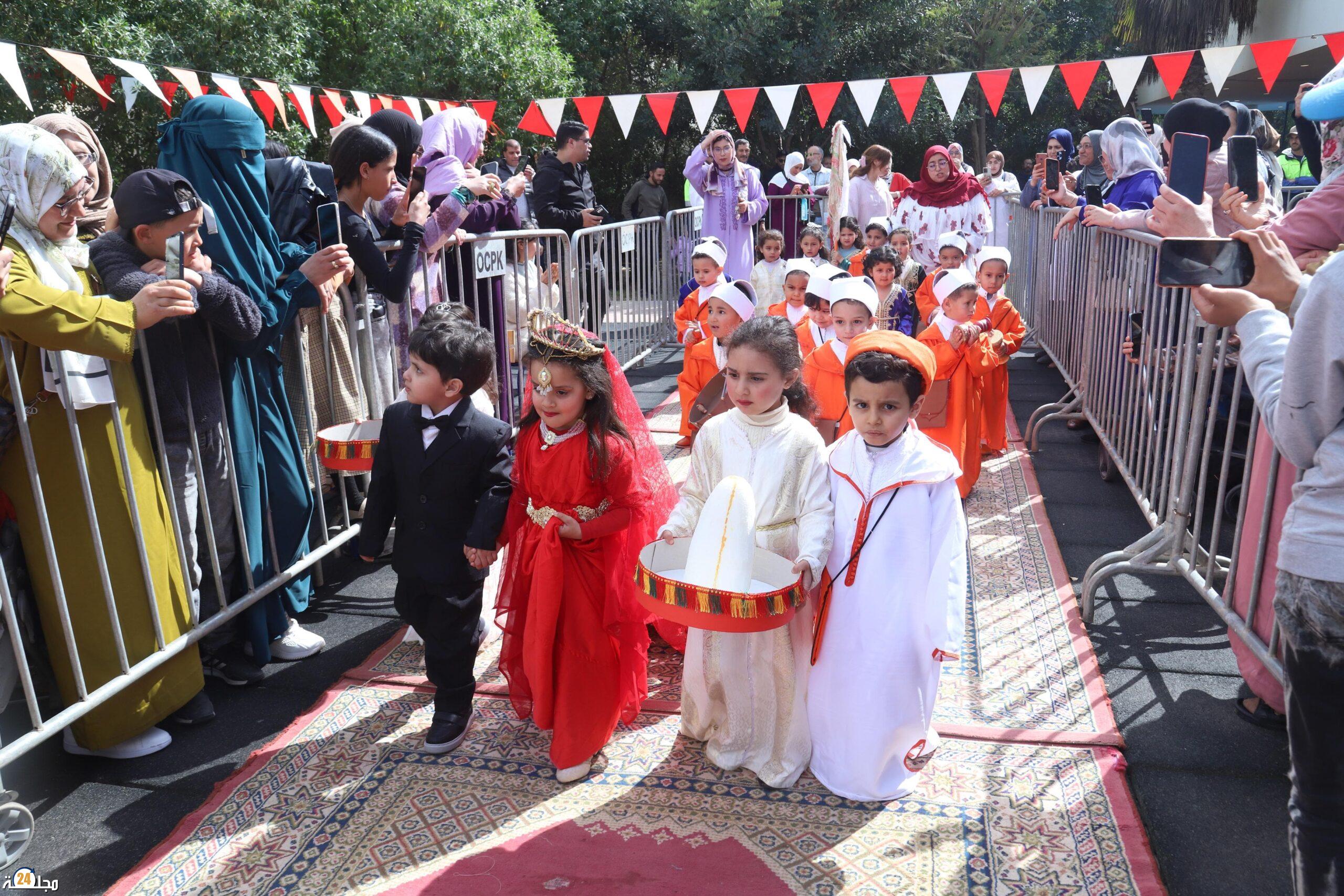 وقد اختير للمهرجان شعار “من كل جهة حكاية.. والمغرب يجمعنا”، في رسالة رمزية تؤكد على أهمية ترسيخ قيم الوحدة الوطنية في ظل التنوع الثقافي الذي يميز مختلف جهات المملكة. وشهدت فقرات هذا الموعد التربوي، الذي انطلق في الثالثة بعد الزوال، تقديم عروض فنية متنوعة عكست تمثيلًا لعدد من المدن والمناطق المغربية، حيث تألق الأطفال بأزياء تقليدية مستوحاة من التراث المحلي، وقدموا لوحات حركية استحضرت العادات والتقاليد المغربية الأصيلة.