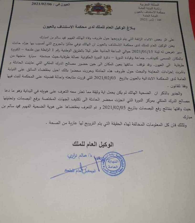 ان الهالك توفي متأثرا بالجروح التي أصيب بها جراء تعرضه لحادث سير ليلة 15/01/2021 حوالي الساعة الحادية عشر ليلا بالطريق الوطنية طنجة – لكويرة ، بمنطقة تسمى اكنيدلف جماعة الدورة إقليم طرفاية ، حيث صدمته سيارة متجهة من طرفاية الى العيون وقد توقف سائقها الى حين قدوم مصالح الدرك الملكي التي عاينت الحادثة و باشرت اجراءات المعاينة و البحث حول ظروف هذه الحادثة و حررت محضرا بذالك احيل بمقتضاه السائق على النيابة العامة بالمحكمة الابتدائية بالعيون بتاريخ03/02/2021 التي قررت متابعته و الحالت قضيته على المحكمة للبت فيها وفقا للقانون .
