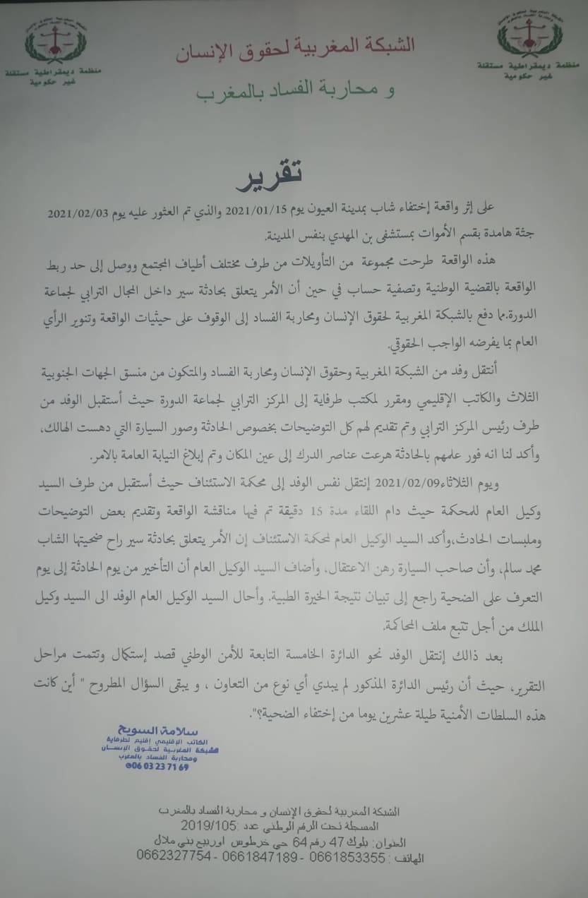 توصلت مجلة 24 بتقرير الشبكة المغربية لحقوق الإنسان و محاربة الفساد بالمغرب بخصوص حادثة السير بنفوذ الجماعة الترابية الدورة إقليم طرفاية و التي راح ضحيتها الشاب محمد سالم فهيم بعد تغيبه عن العائلة مدة 20 يوم .